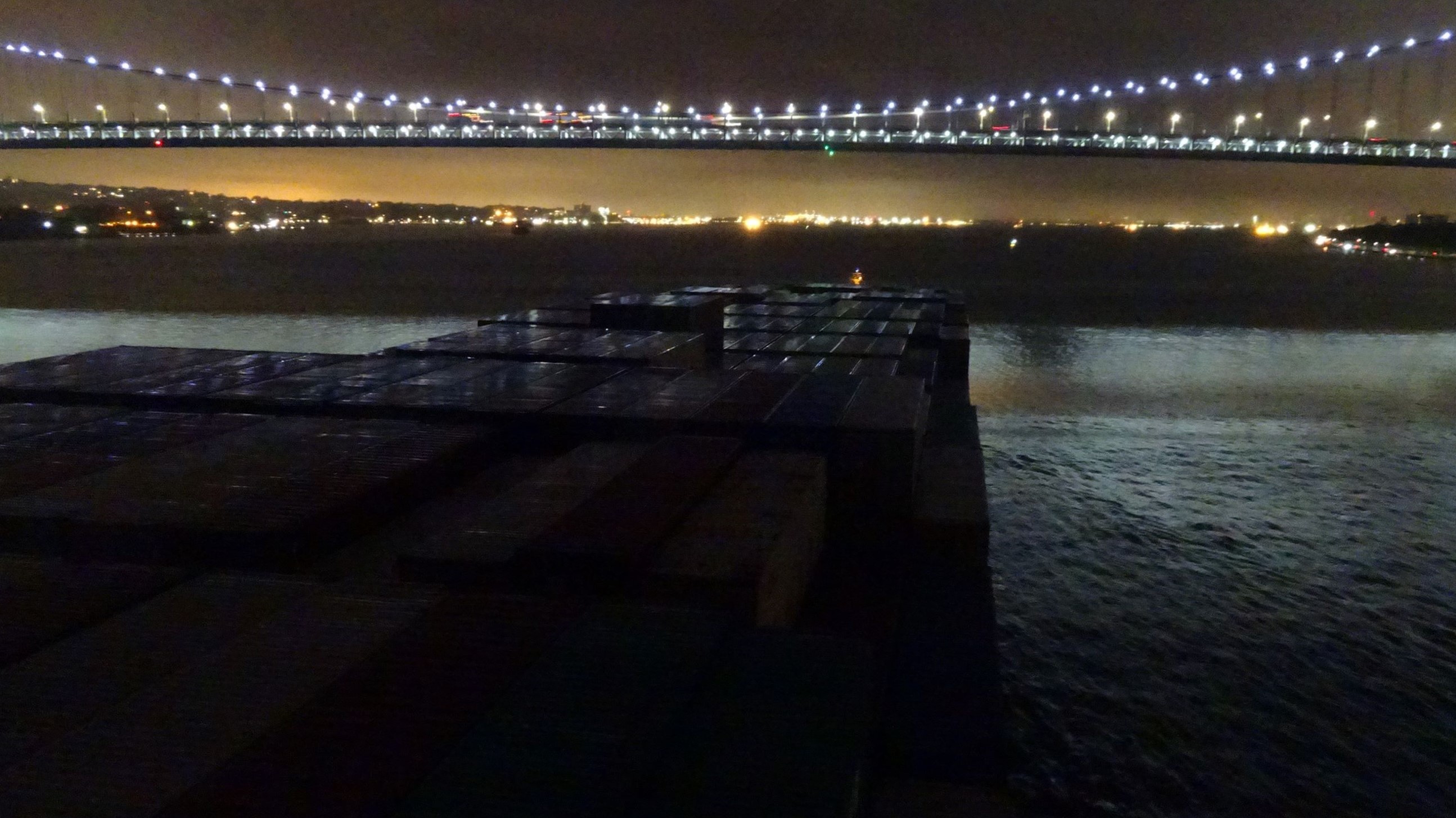 4h du matin, l’esprit enfariné, je jette un coup d’œil au hublot de ma cabine : le Pont Verrazano scintille dans la nuit, semblant marquer l’entrée officielle des Amériques. Je me précipite à la salle de navigation, les pilotes, experts du port, sont à bord pour guider le Capitaine dans les méandres de la baie. Un épais brouillard dissimule Manhattan et ses gratte-ciel. Seules les plus proches côtes et la Statue de la liberté se détachent dans la brume. Après deux dernières heures de navigation, assistés des remorqueurs et du soleil levant, nous nous amarrons enfin sous les portiques de Port Elizabeth, immense tapis de conteneurs trimballés de bout en bout par une armée grouillante de véhicules aussi improbables que hauts sur pattes.