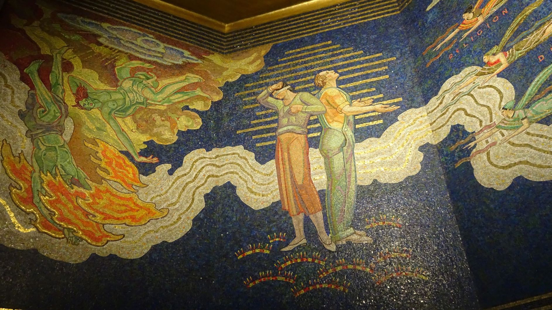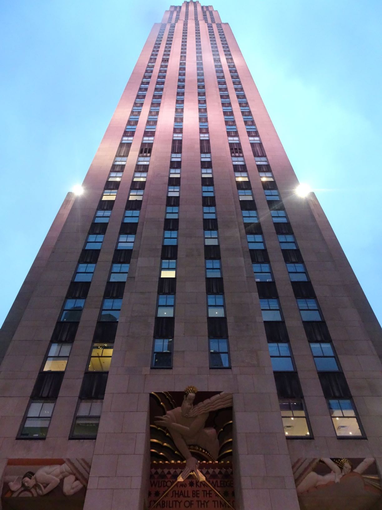 Je dors à Harlem, chez un sympathique Haïtien, mélomane pessimiste. Les deux jours suivants, rebelote, je sillonne en long et en large la ville et le gigantesque Museum d’histoire naturelle. Central Park, Public library, High line (la voie verte de New-York), Greenwich Village, ferry gratuit vers Staten Island (pour la vue sur la Statue de la Liberté et la skyline de Manhattan), Brooklyn Bridge, le captivant autant qu’effrayant Times Square (avec tous ces écrans je suis un moustique devant un halogène) et enfin le Rockfeller Center : j’ai trouvé saisissant de voir sa philosophie libérale gravée et illustrée sur tous les murs, non dénuée de valeurs humanistes (égalité, éducation, justice…) mais sous-tendant in fine, sous couvert de religion, un individualisme et un capitalisme destructeurs et « flamboyants », au sens propre, les sourds à la doctrine étant précisément illustrés brûlant dans les flammes de l’enfer.