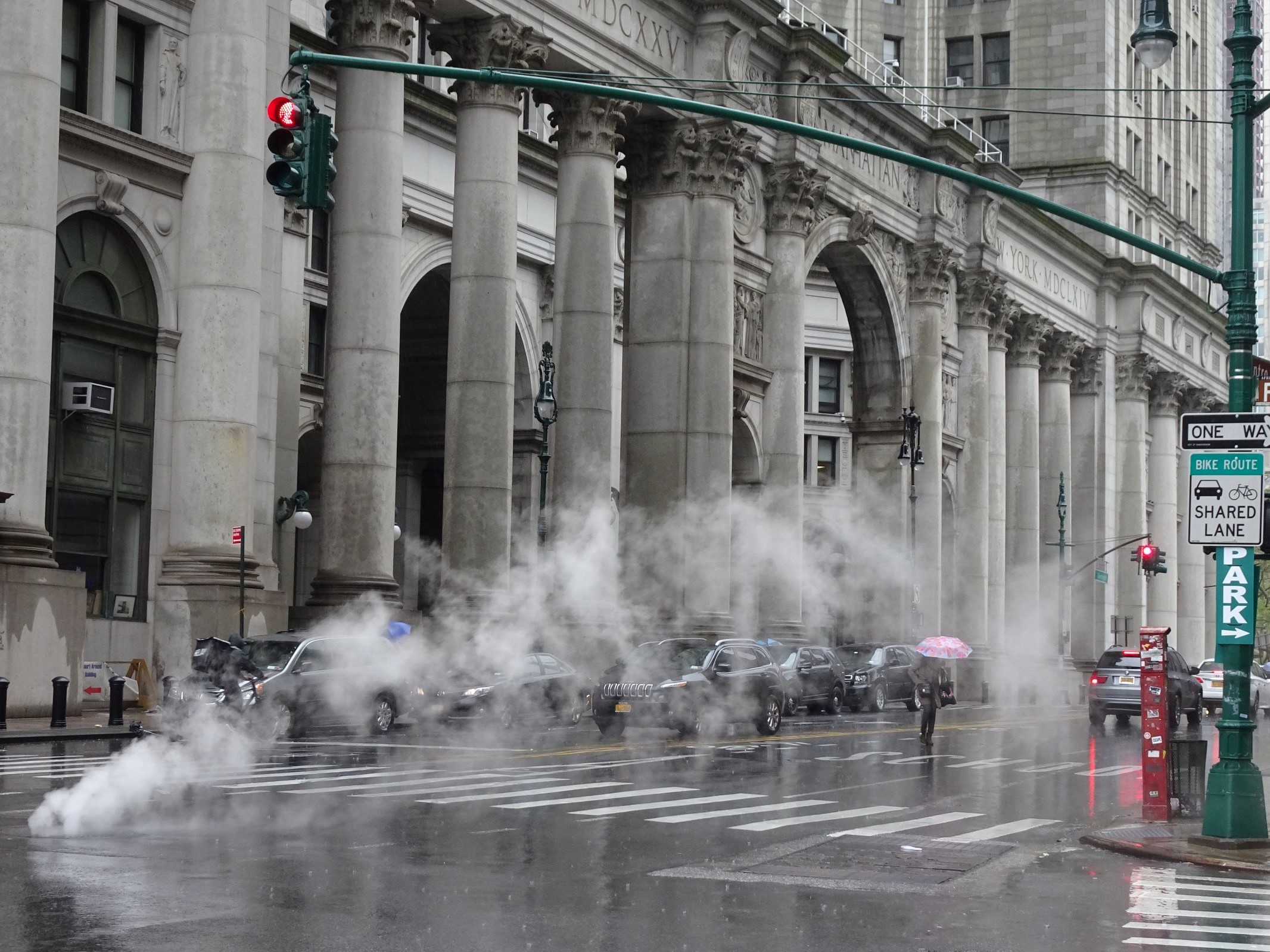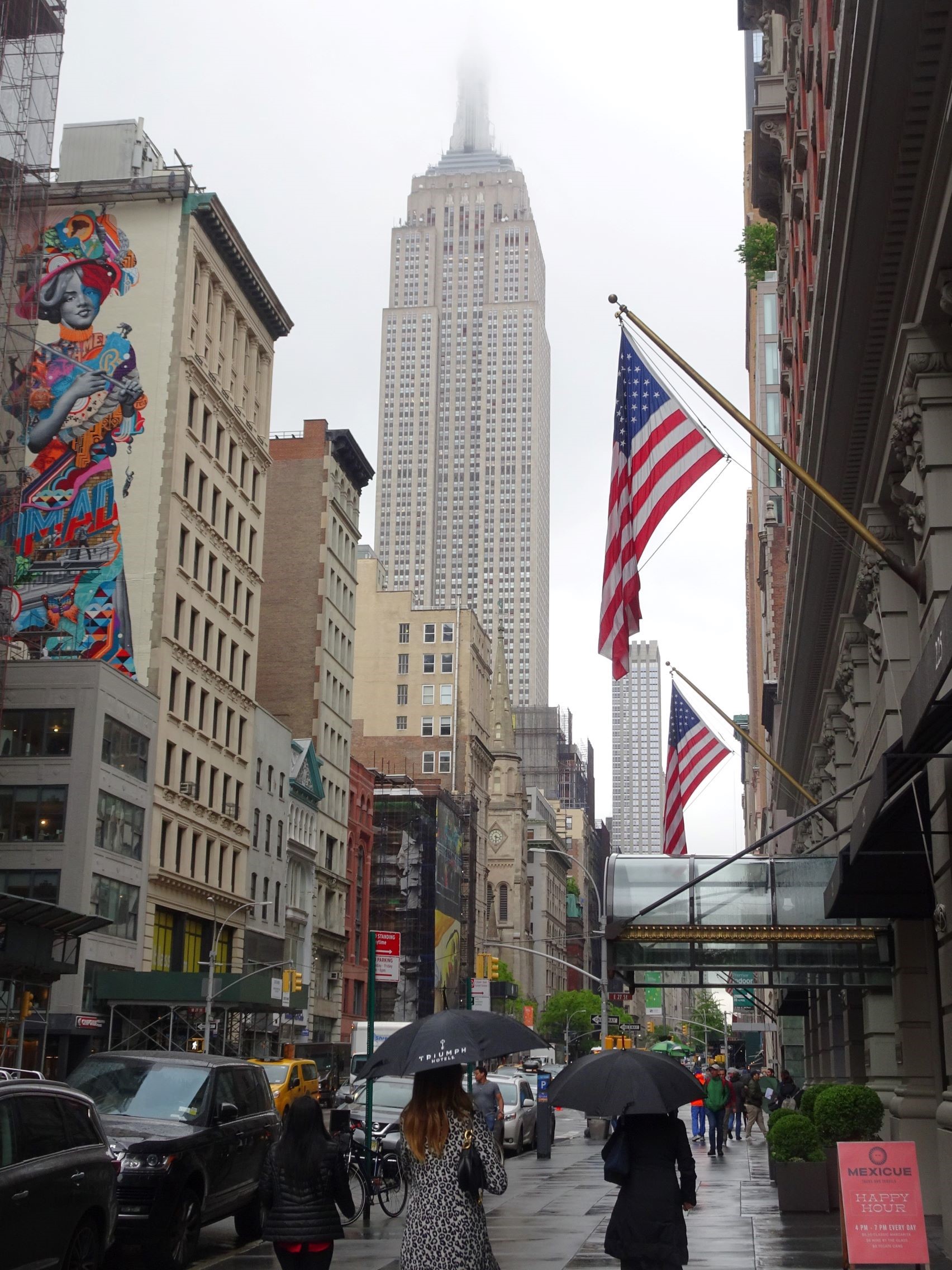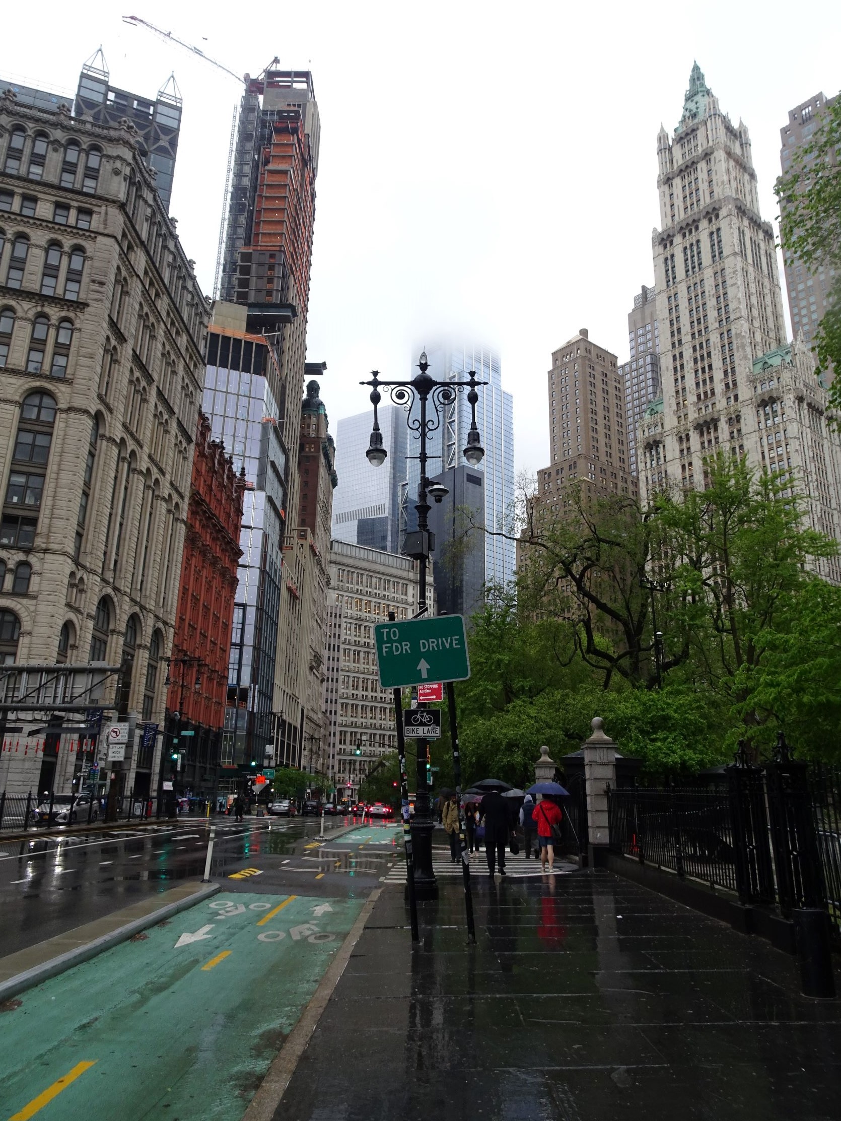 Randonnée urbaine sous la pluie battante et la protection de l’esprit Rastafari : carapace de pluie revêtue, je suis jaune, vert, rouge fluo, difficile de me louper ! Des bataillons de parapluies noirs filent sur les trottoirs et traversent au petit bonheur la chance, slalomant entre les flaques et les taxis jaunes. Les bouches d’égout qui fument, les gratte-ciel et les grues qui disparaissent littéralement dans les nuages bas. Le trafic chaotique et bruyant, les ambulances et camions de pompiers en spectacle son & lumière, les kiosques à junkfood qui clignotent à chaque coin de rue… un joyeux bordel ! Je descends la 5ème avenue : Empire state building, Madison square, Union square, Flatiron building, hallucination à chaque intersection qui dévoile de nouvelles tours. 4ème avenue, Lafayette street, Little Italy, Chinatown, pause !