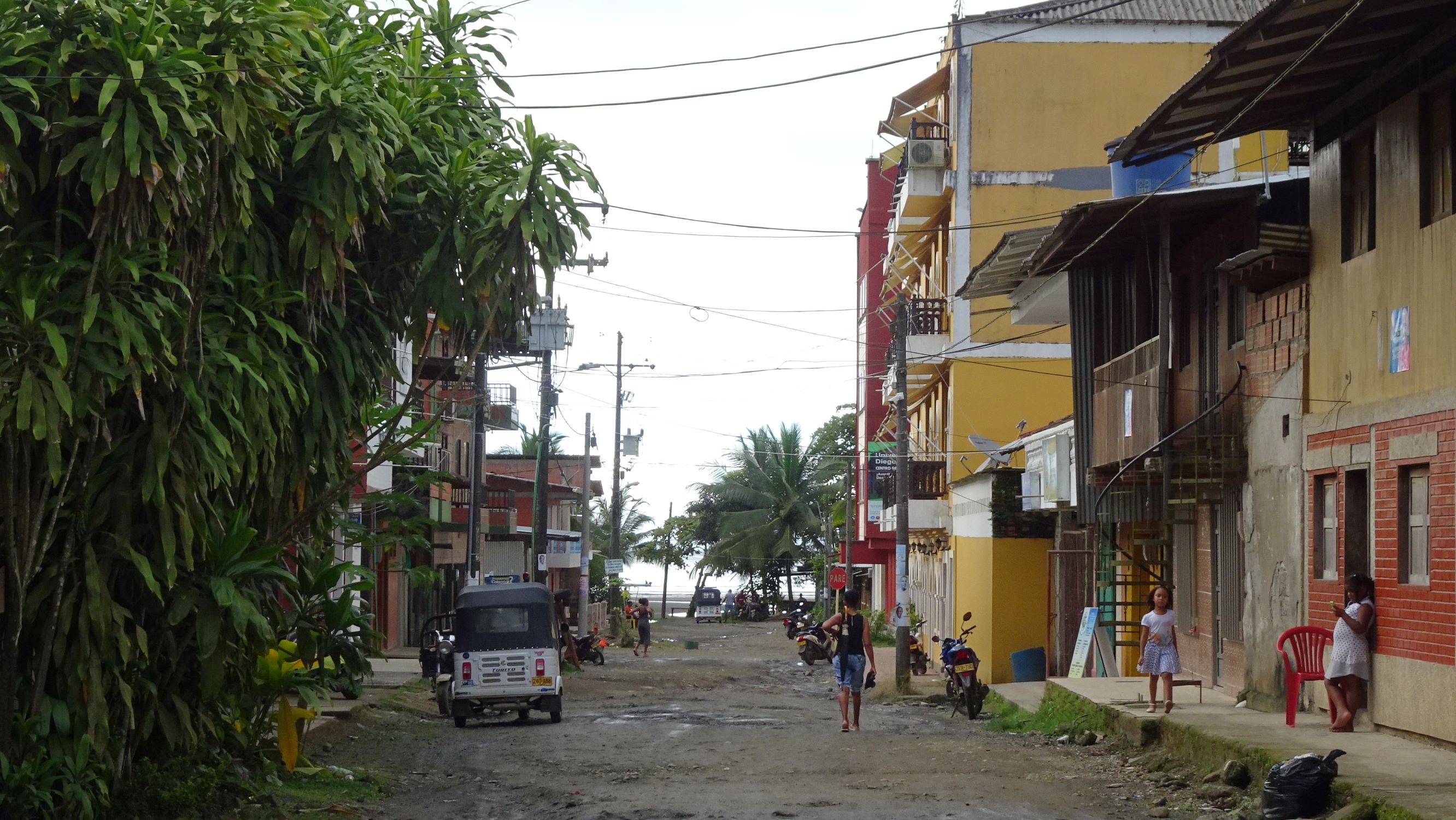 Nous mettons pied à terre dans le village de Bahía Solano. La population afro, les rues en terre battue et le rythme tranquille nous rappellent l’Afrique, les tuk-tuk qui sillonnent le village et la jungle en arrière-plan donnent un petit air d’Asie. Le Chocó nous montre une autre facette de la Colombie, de son histoire, de la diversité de ses paysages et populations.