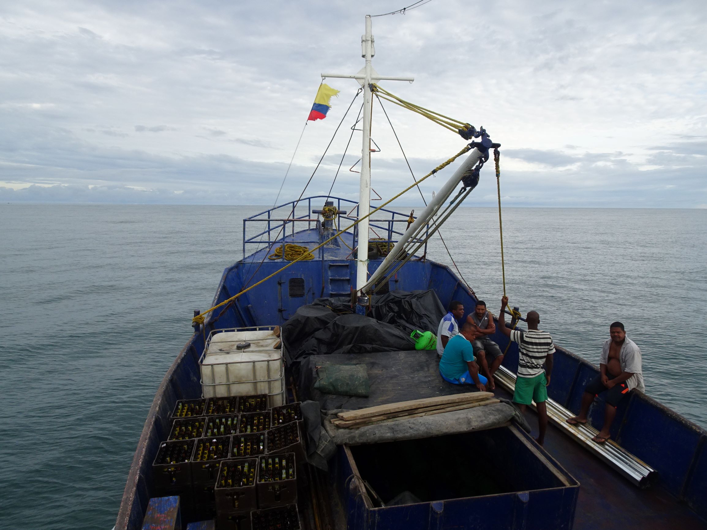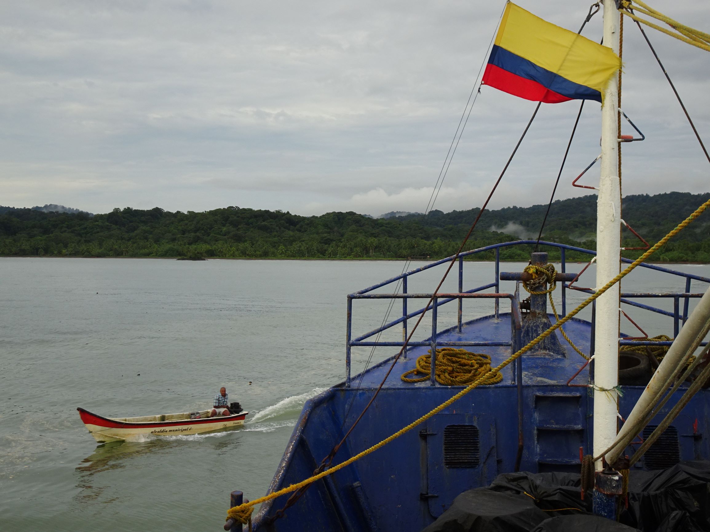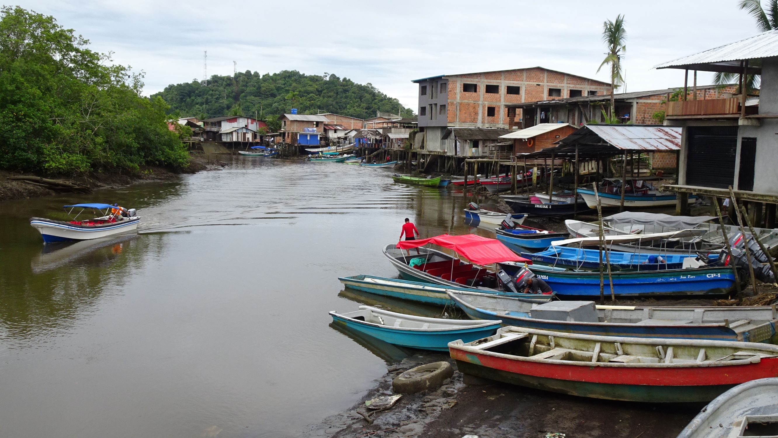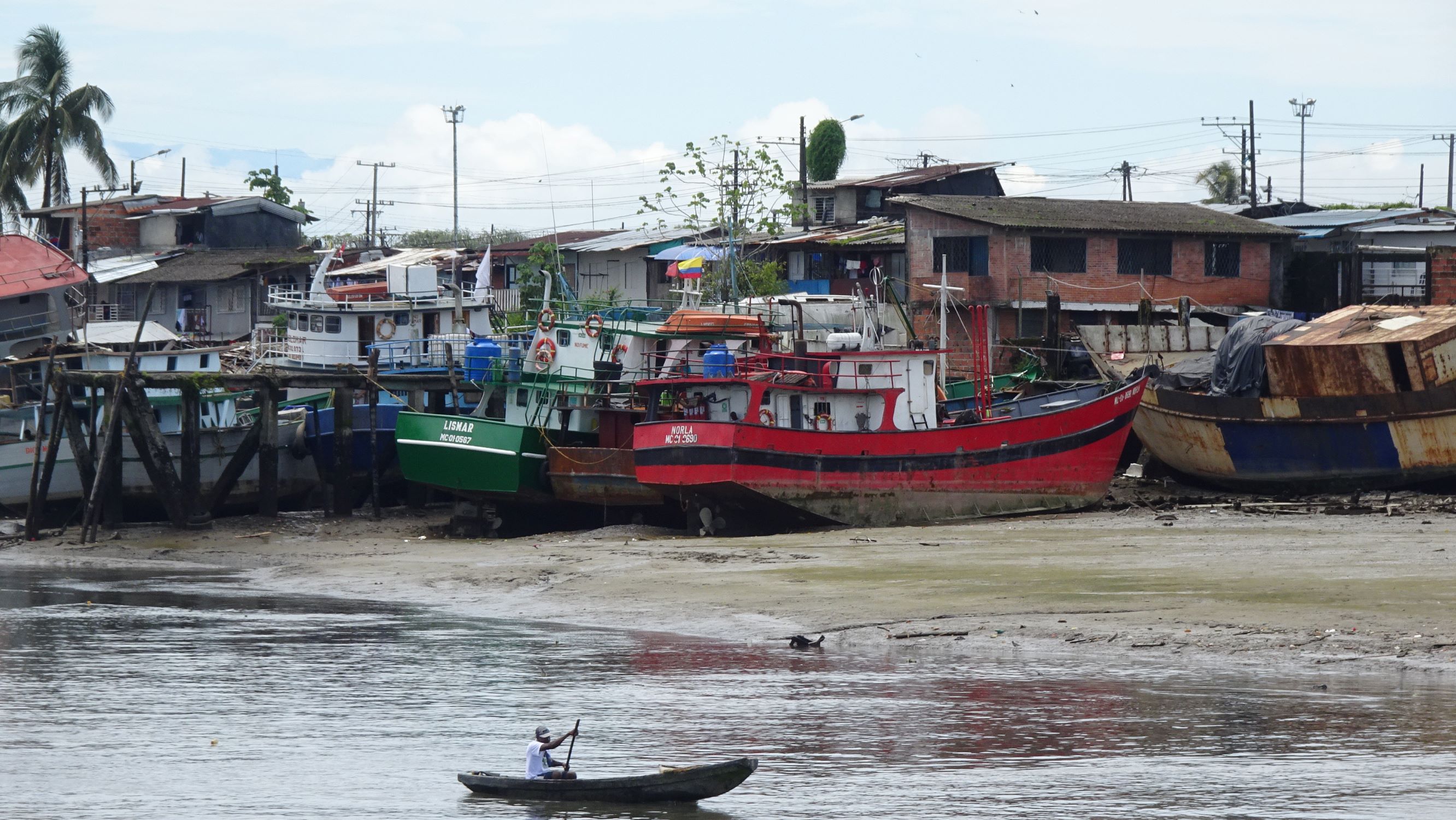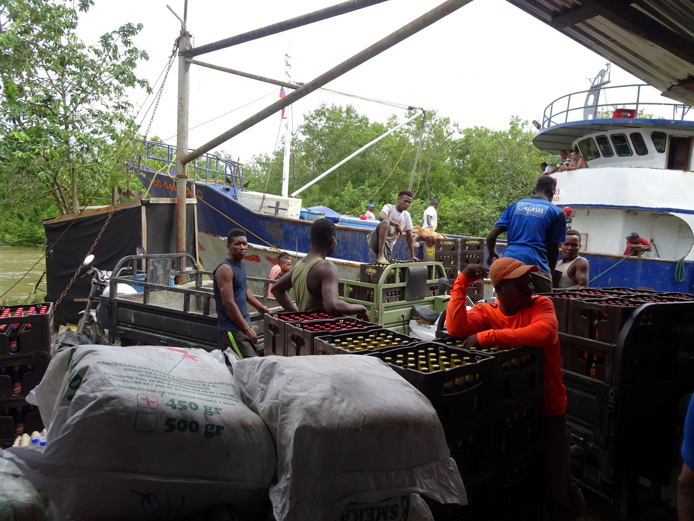A quai, c’est le branle-bas de combat, tout le monde est sur le pied de guerre car il faut charger le bateau rapidement pour qu’il parte avant la fin de la marée montante. A bord, outre les poissons (surtout des petits requins…), notre cargaison est essentiellement constituée de bonbonnes de gaz et bouteilles de bière vides. En sens inverse, les cargos transportent vers le Chocó, entres autres, marchandises, tuk-tuk, scooters et caisses de bières (pleines cette fois).