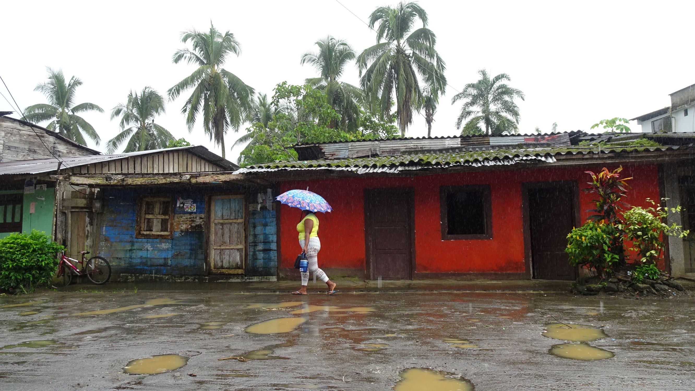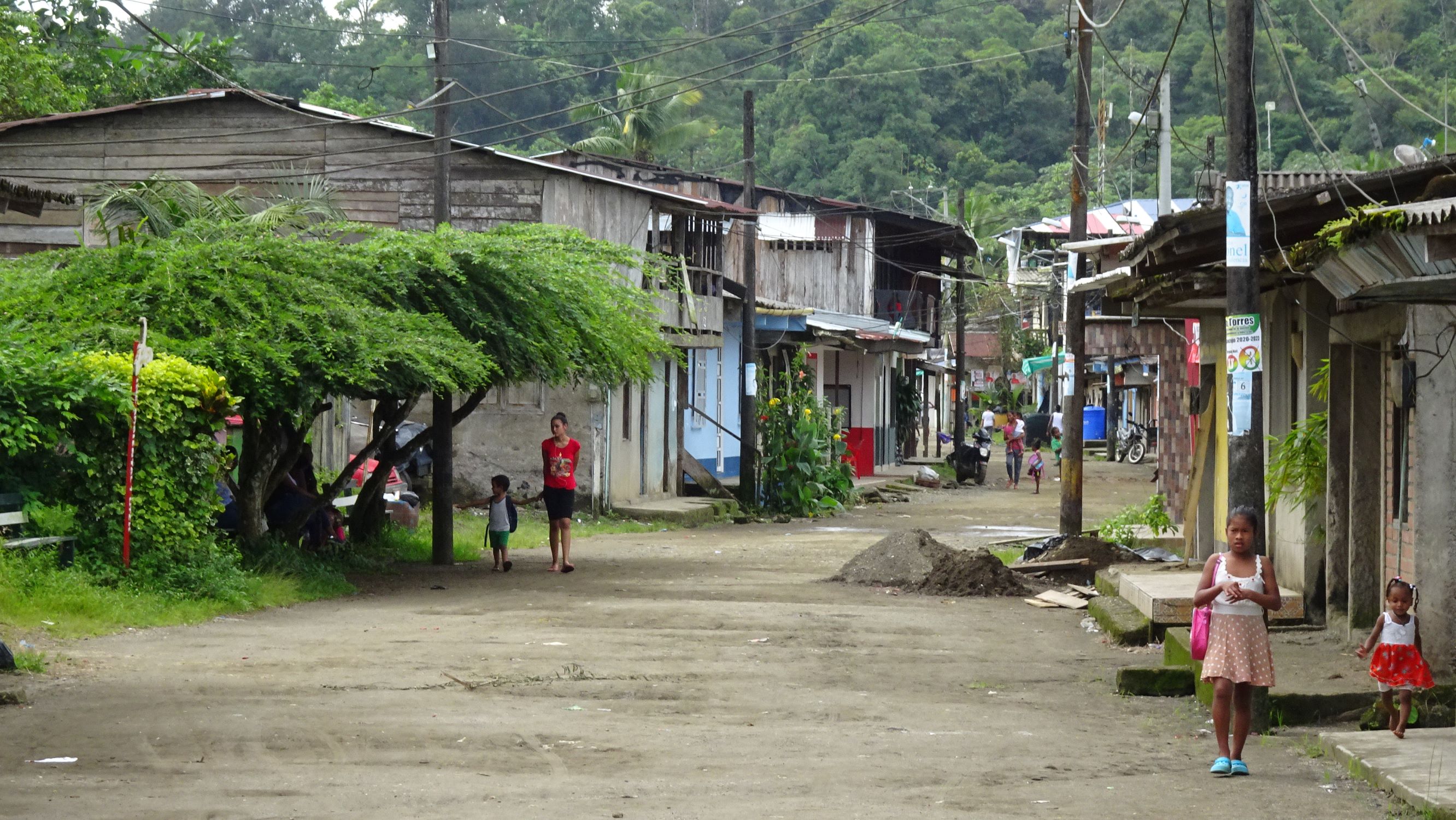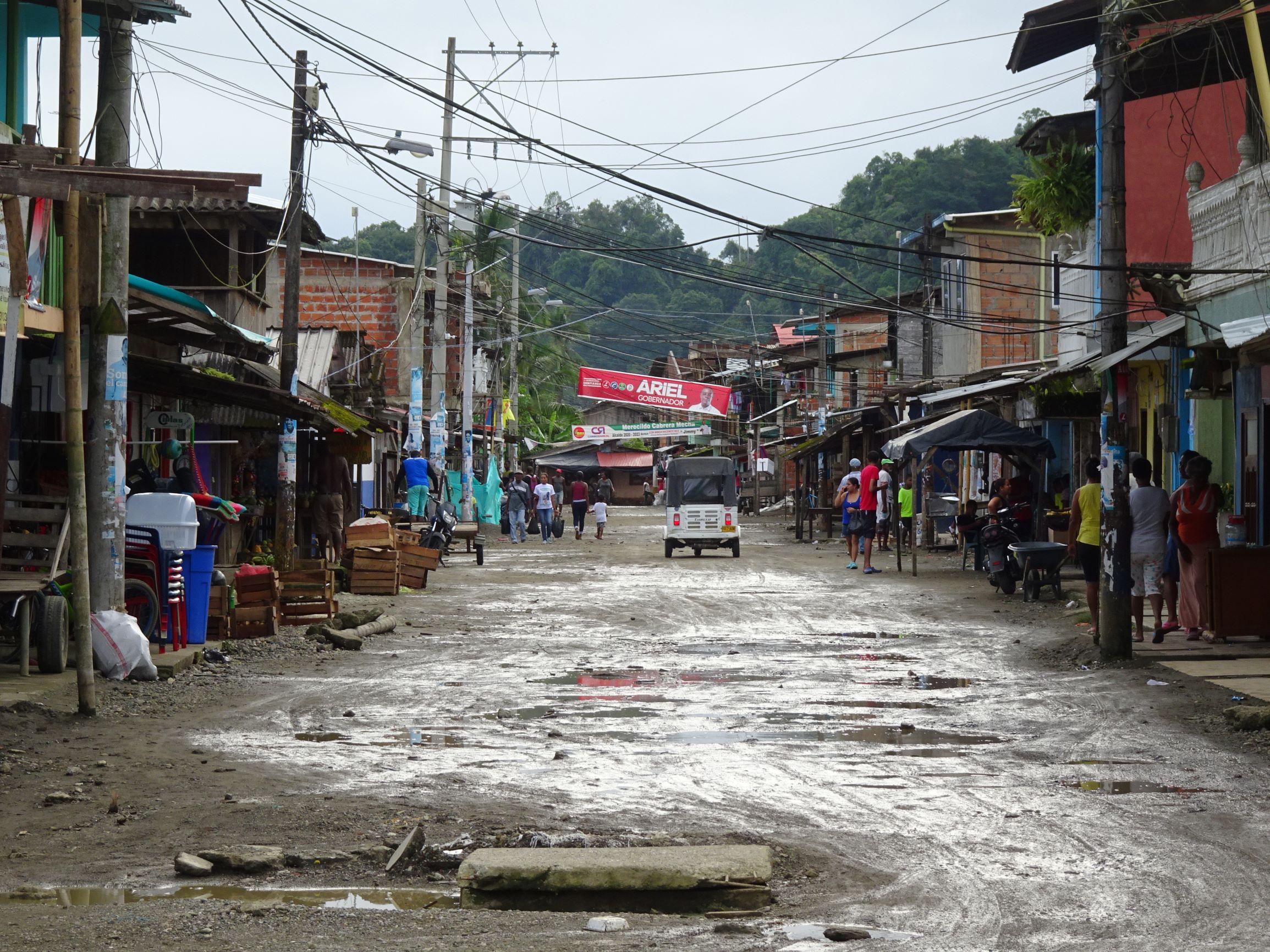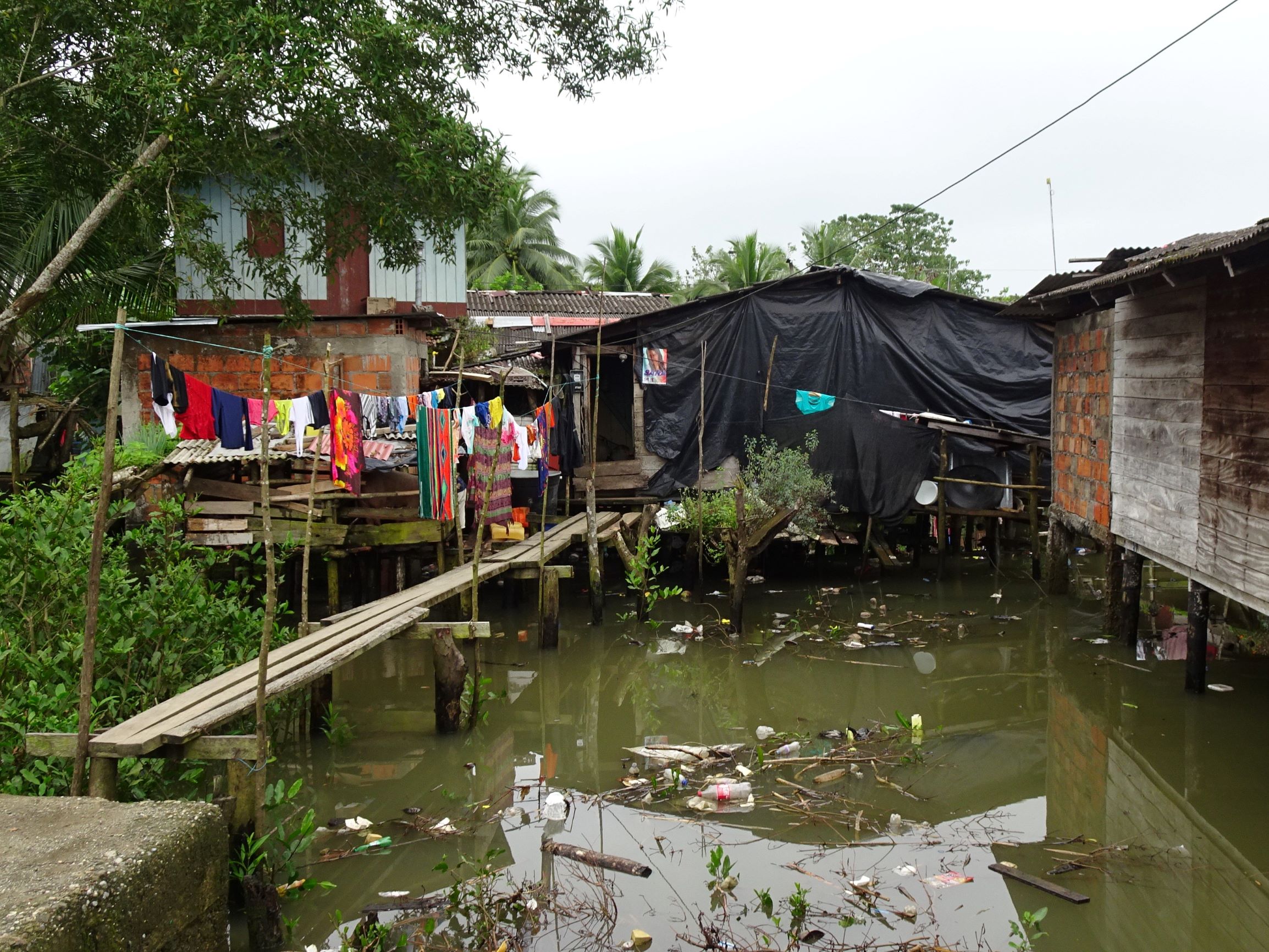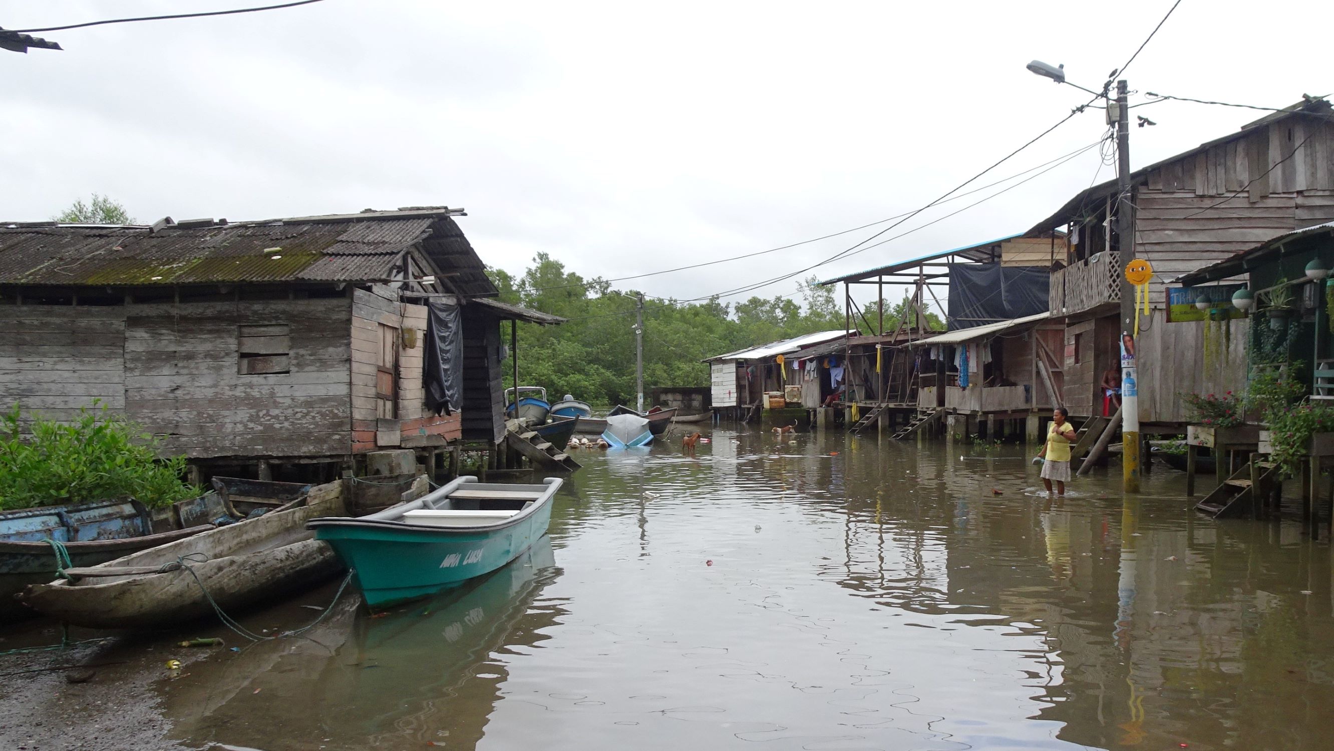 Nuquí : petite ville sur pilotis entre mangrove et océan. Lors des marées montantes, femmes, hommes, enfants et chiens pataugent dans les ruelles inondées ou se réfugient en hauteur. A marée basse, tout le monde réinvestit les rues, encombrées par les poules et filets de pêche, et les enfants jouent à la brouette ou aux billes sous le plancher des maisons.