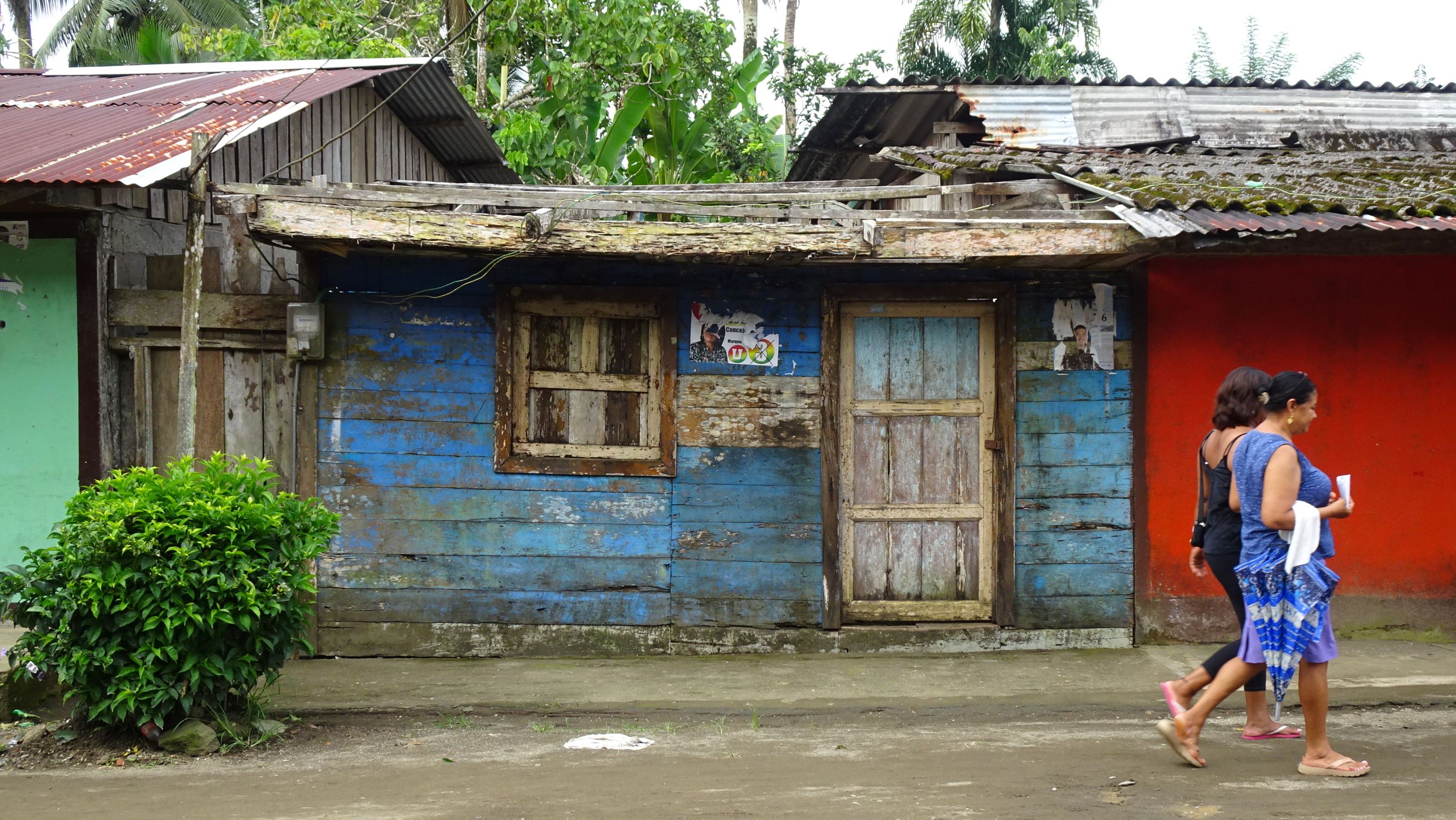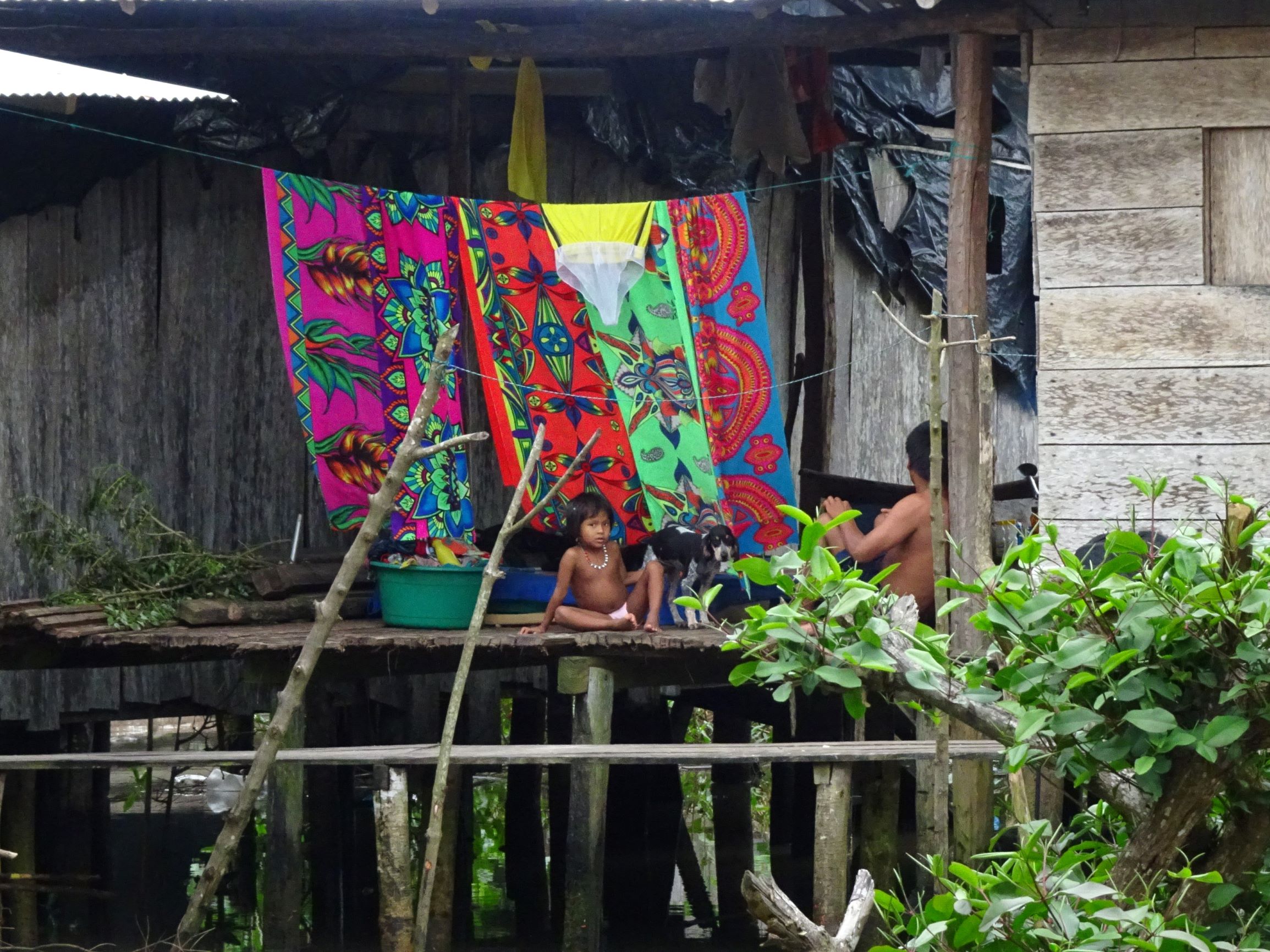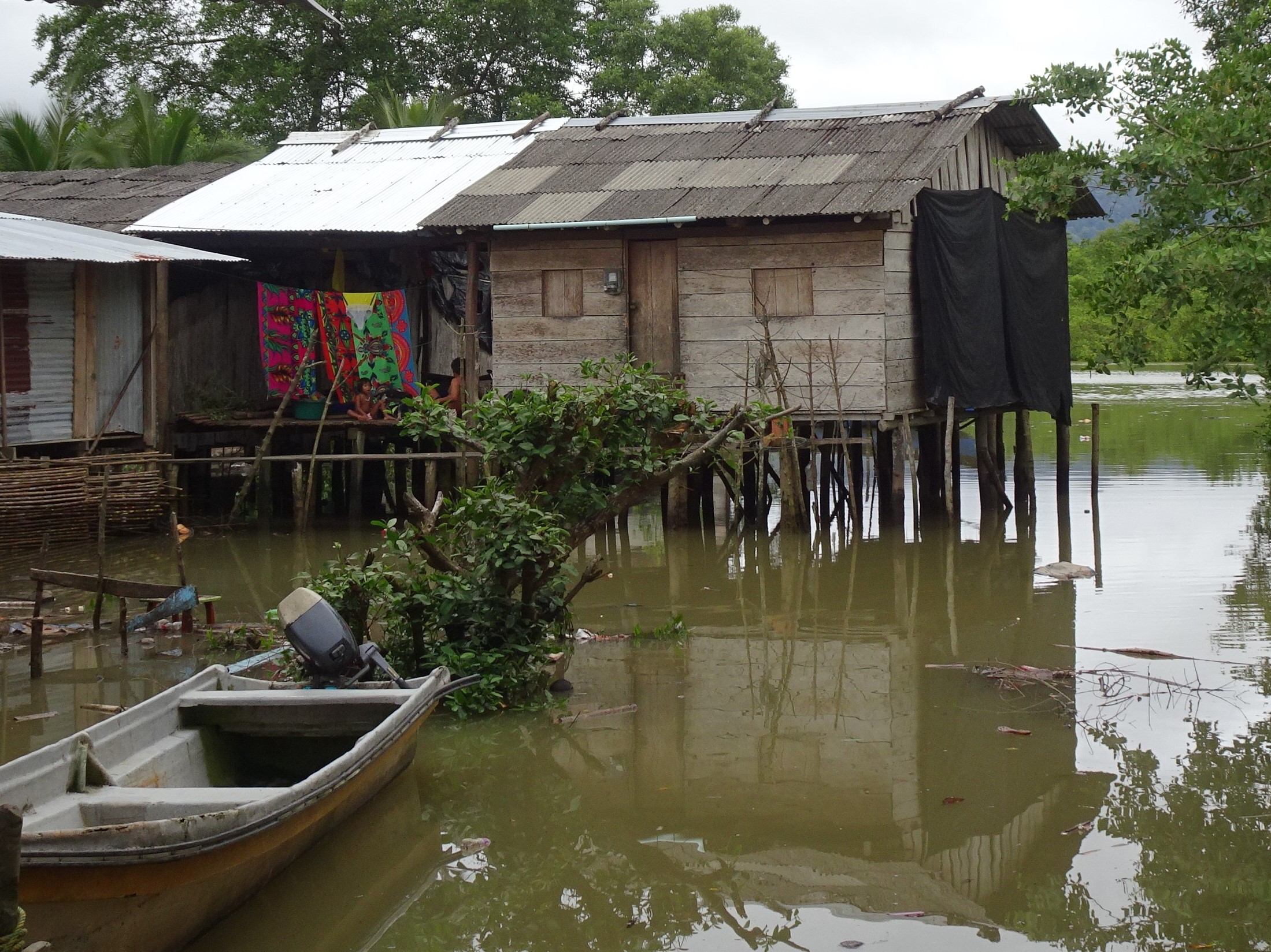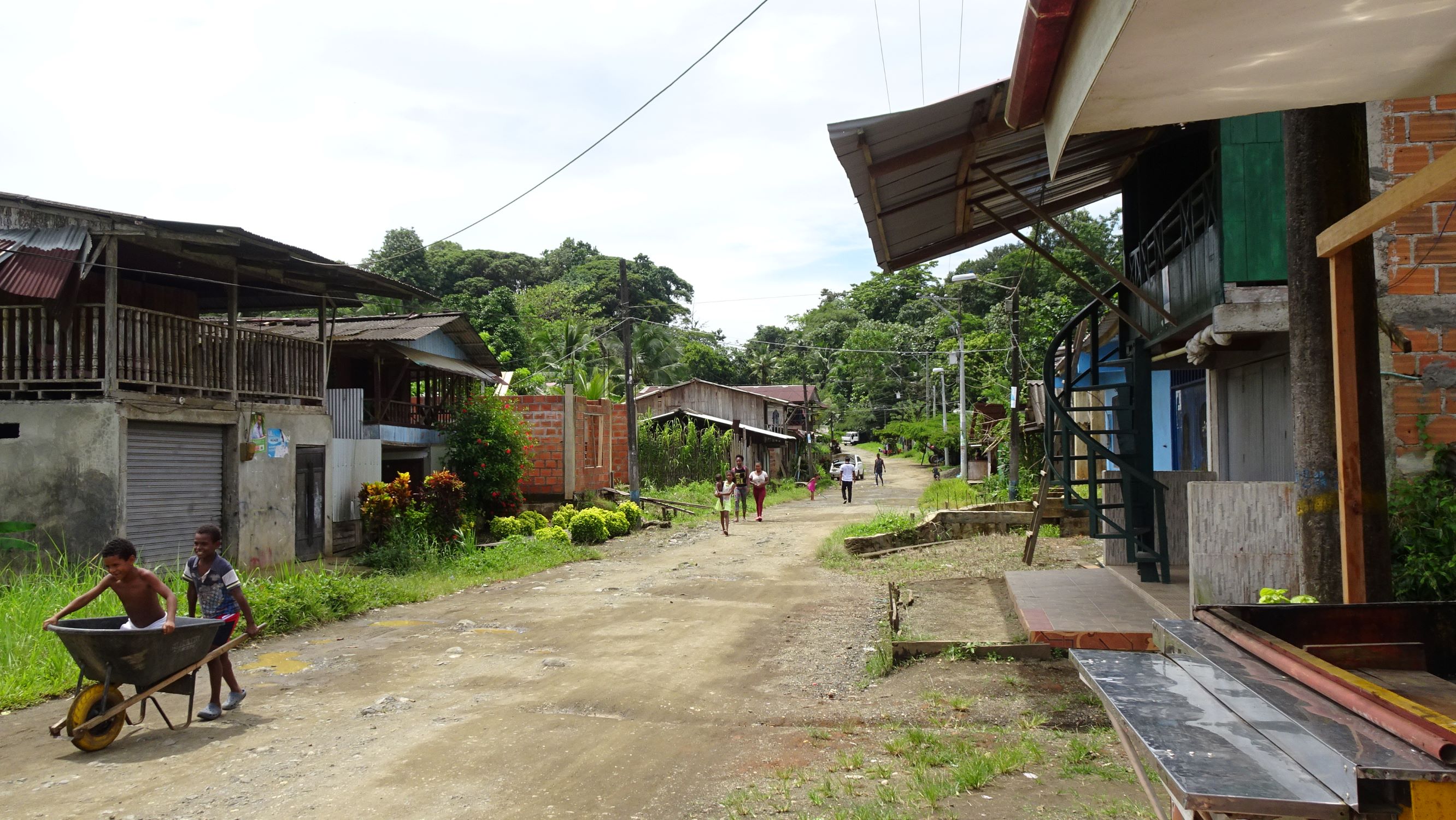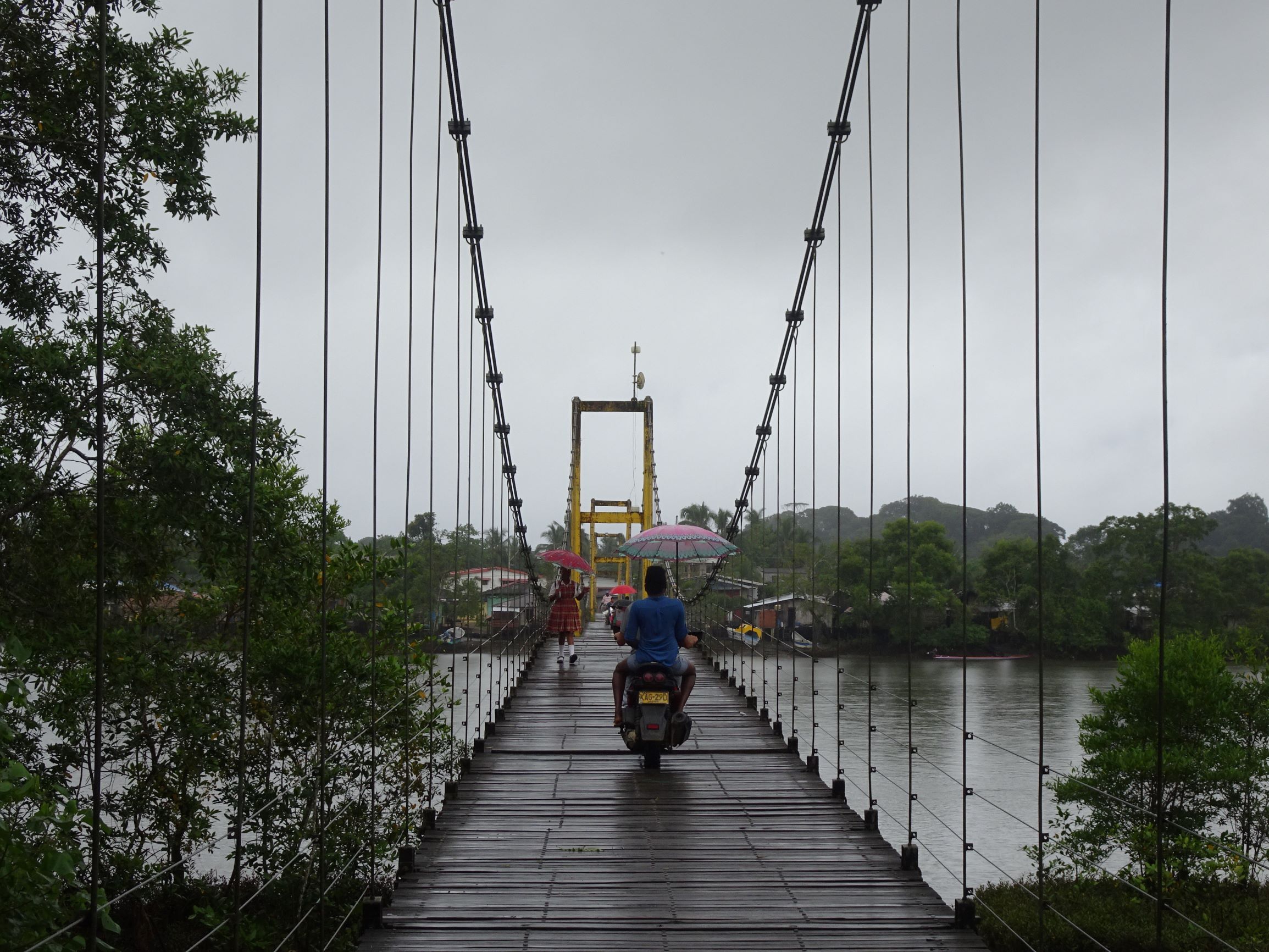 Nuquí : petite ville sur pilotis entre mangrove et océan. Lors des marées montantes, femmes, hommes, enfants et chiens pataugent dans les ruelles inondées ou se réfugient en hauteur. A marée basse, tout le monde réinvestit les rues, encombrées par les poules et filets de pêche, et les enfants jouent à la brouette ou aux billes sous le plancher des maisons.