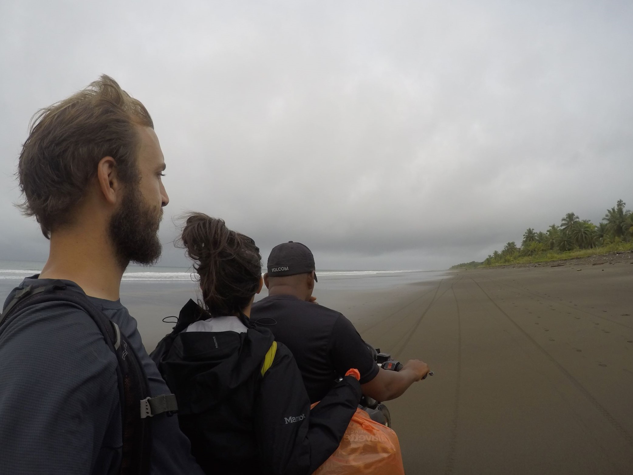 Pour atteindre la plage reculée où les tortues marines viennent pondre, on grimpe chacun derrière un motard mais, à peine partis, l’une des motos tombe en panne et nous voici donc à trois sur une moto qui file sur des kilomètres de plage déserte. Le sable et la marée montante ne rendent pas le tout très stable… la frousse nous prend et on agrippe sacs et mollets contre l’engin.