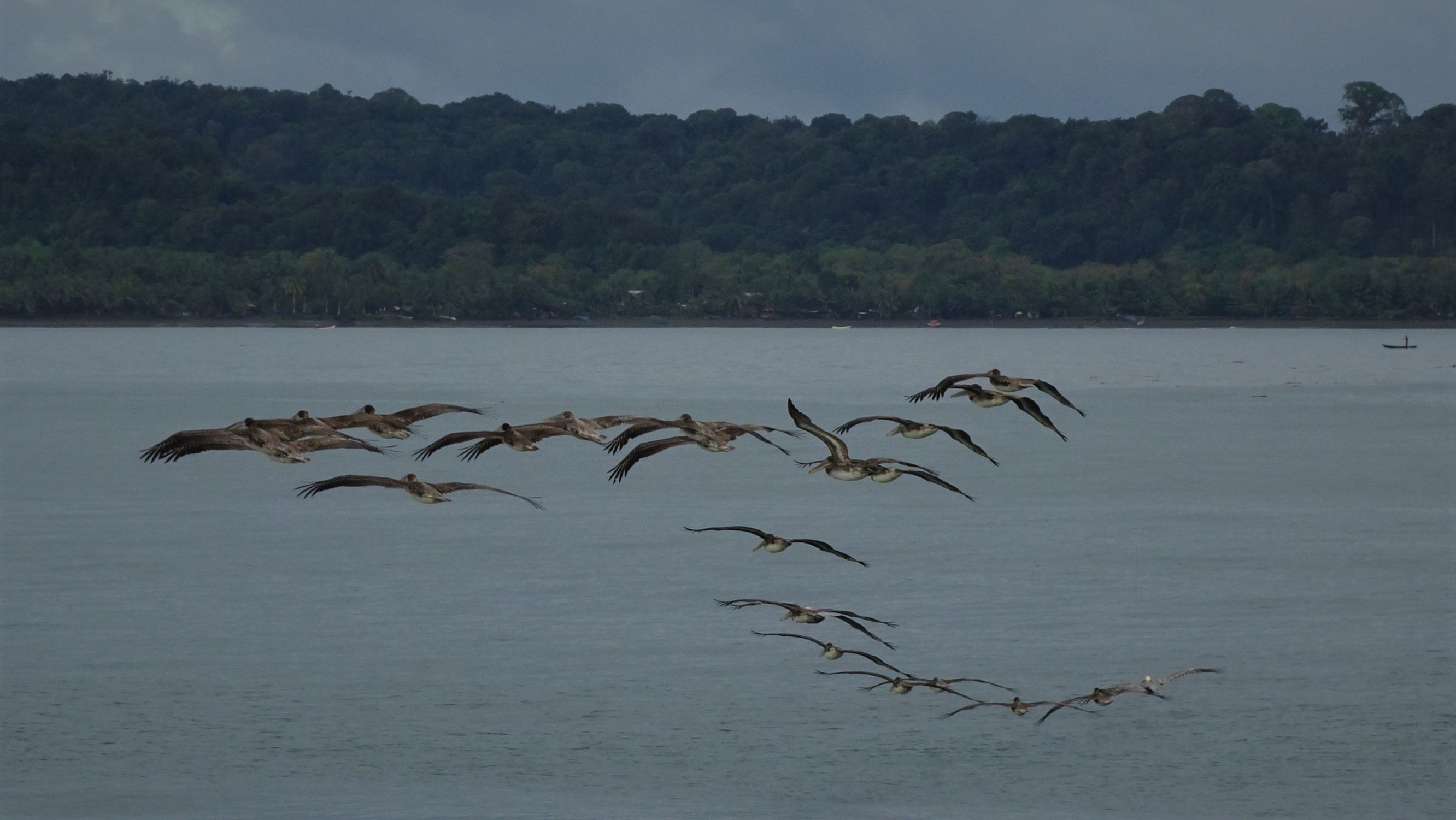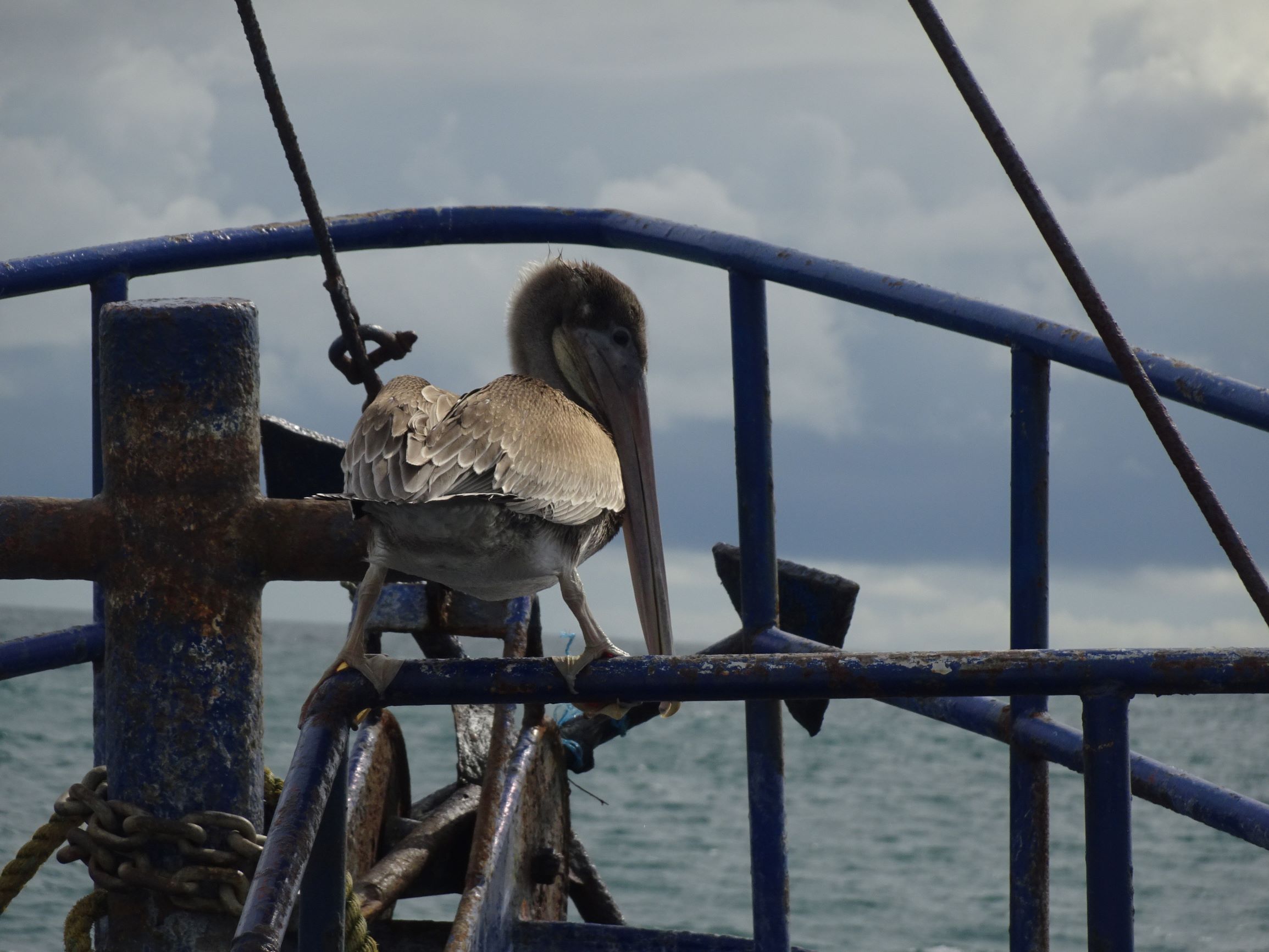 Sur notre route, on aperçoit des dauphins et quelques souffles de baleines dont une frappant sa nageoire à la surface de l’eau avec force et élégance, c’est beau…! Nous croisons aussi Frégates superbes, Fous à pieds bleus et Pélicans bruns, solitaires ou en convois ondulants. Un d’entre eux finira même par se poser à bord, fière figure de proue palmée.
