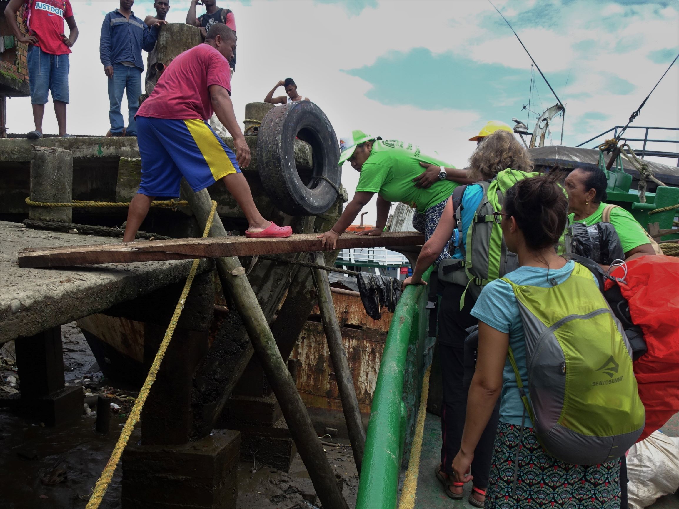 Au petit matin, le Salo entre lentement dans la baie de Buenaventura. De la minuscule lancha en bois à l’imposant porte-conteneurs, toutes sortes d’embarcations se croisent. La nôtre est amarrée à un autre cargo ; il faut enjamber les bastingages de bateau en bateau pour espérer regagner la terre ferme. Mais il reste encore à franchir, non sans peur, une simple planche de bois tendue au-dessus du vide et de la boue pleine de déchets. Femmes et locaux d’abord. Les touristes après, on retrouve le plancher des vaches.