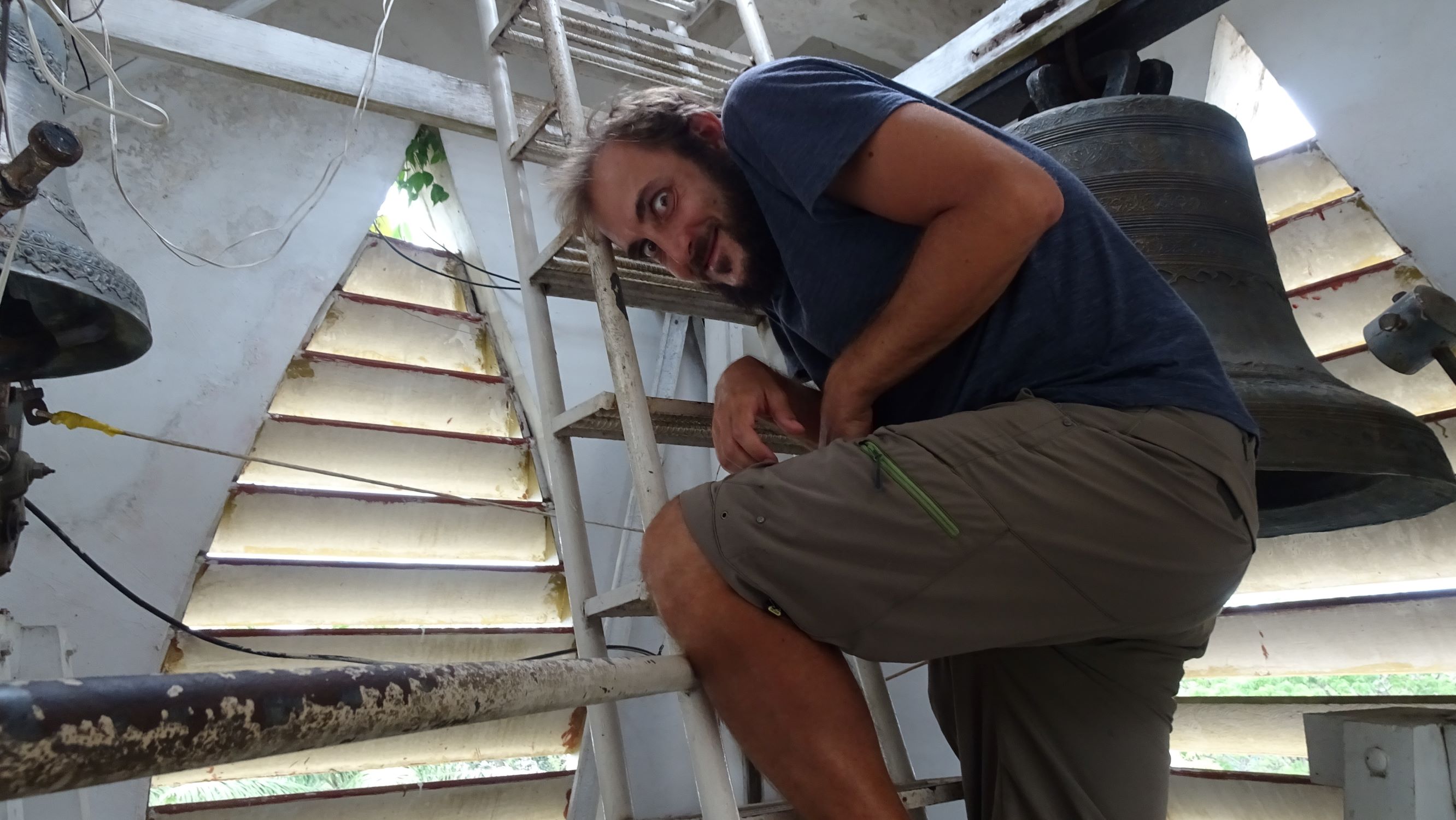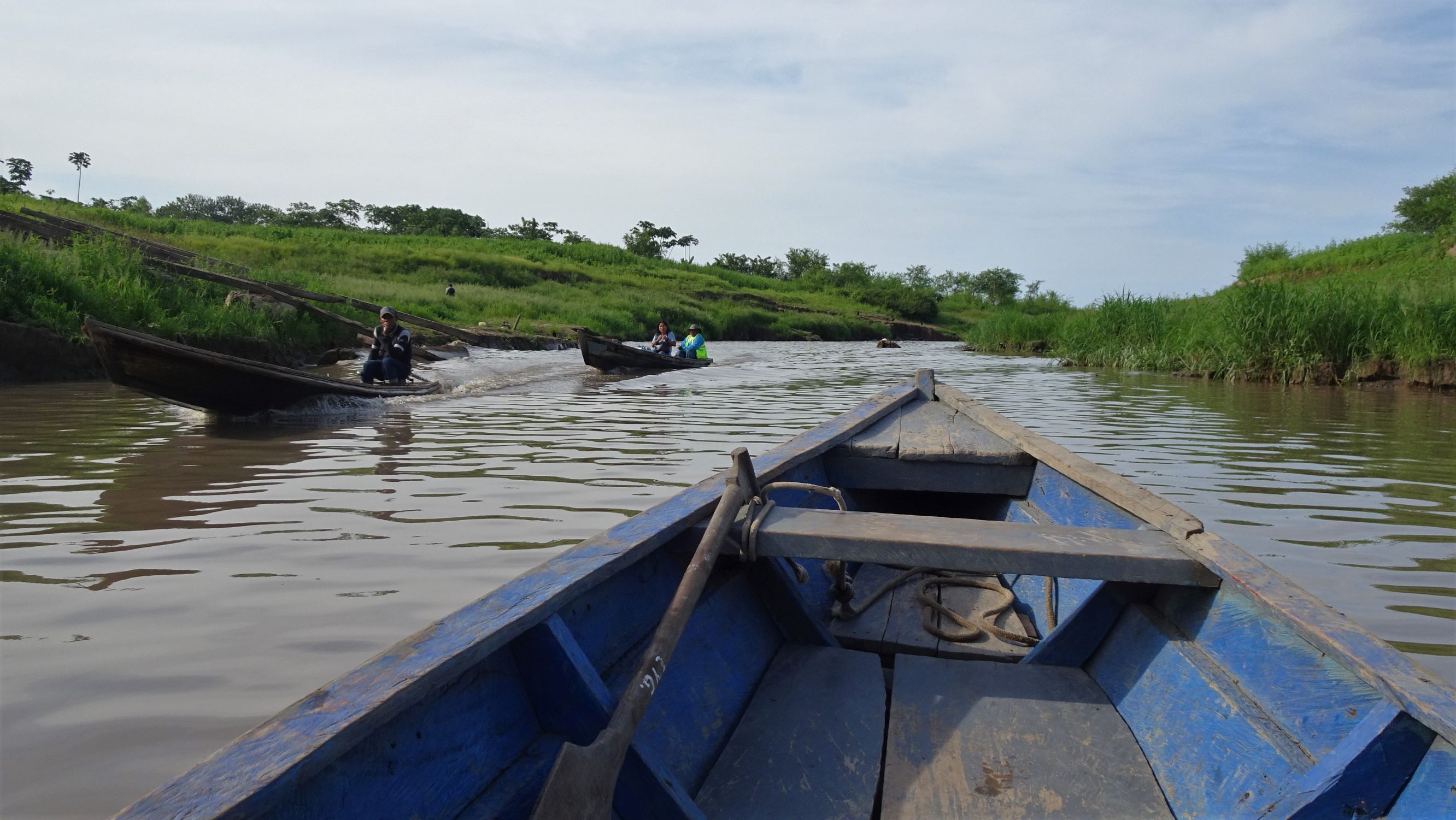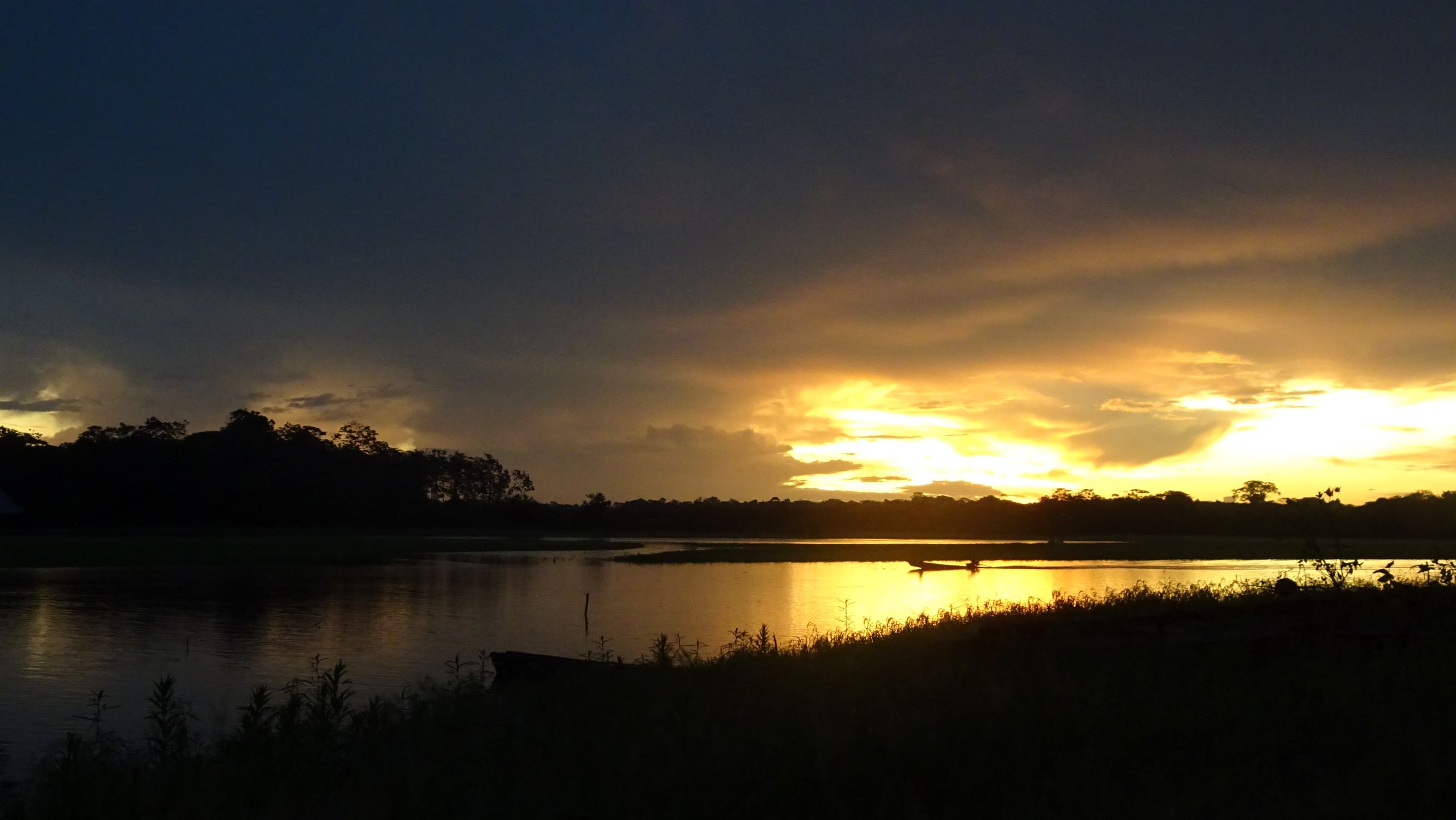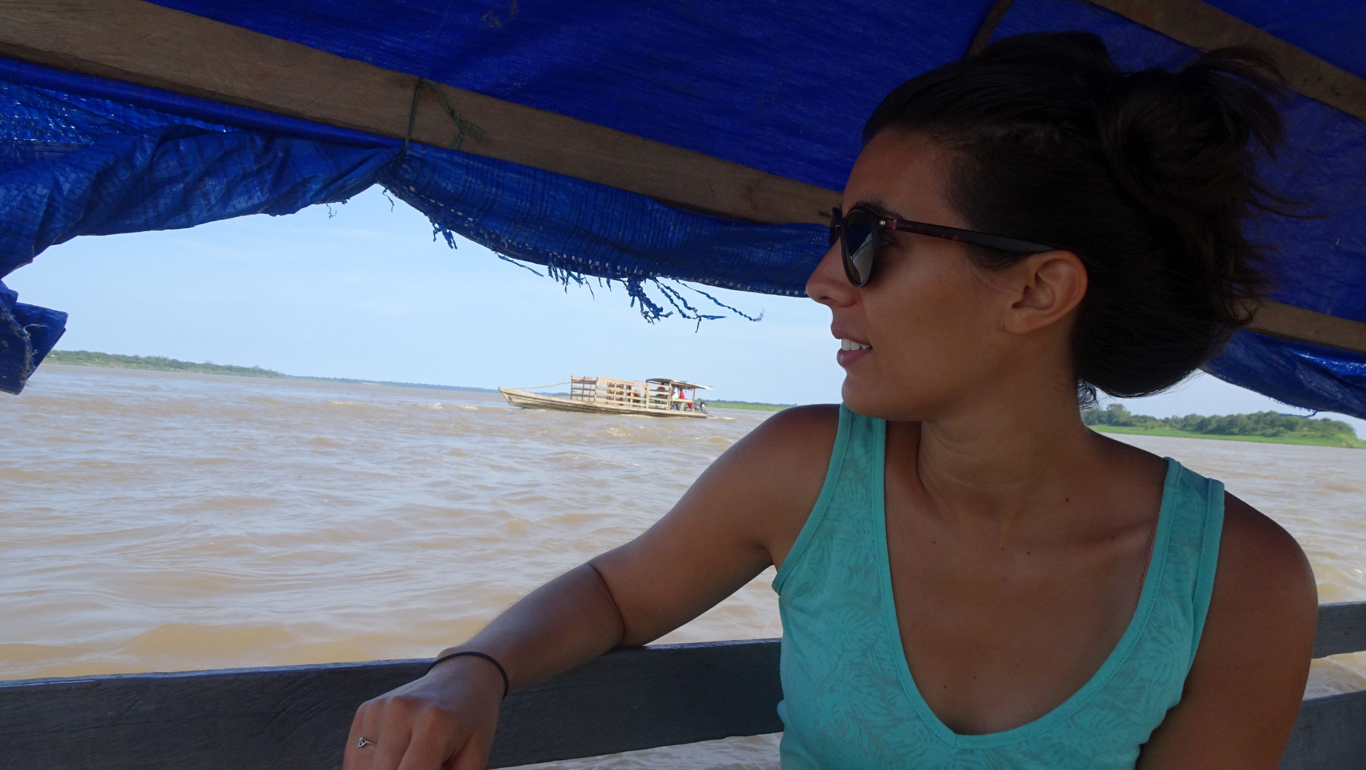 Je profite de ces 4 heures de paisible navigation sans roulis ni tape-cul pour piquer un somme sur l’étroite banquette molletonnée. Au réveil, une grosse averse nous confine sous la bâche en plastique bleu, à regarder les impacts de pluie sur les eaux boueuses, qui prennent une belle teinte lumineuse au retour du soleil.