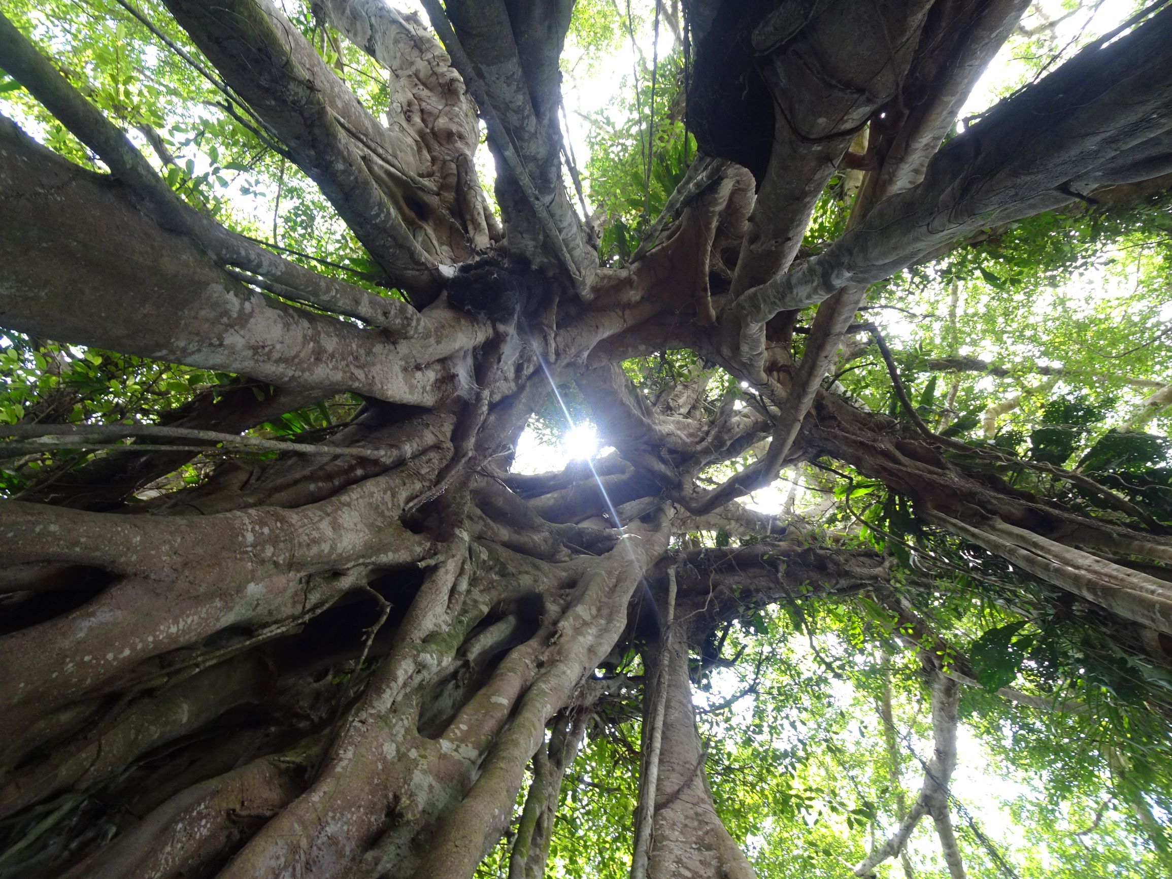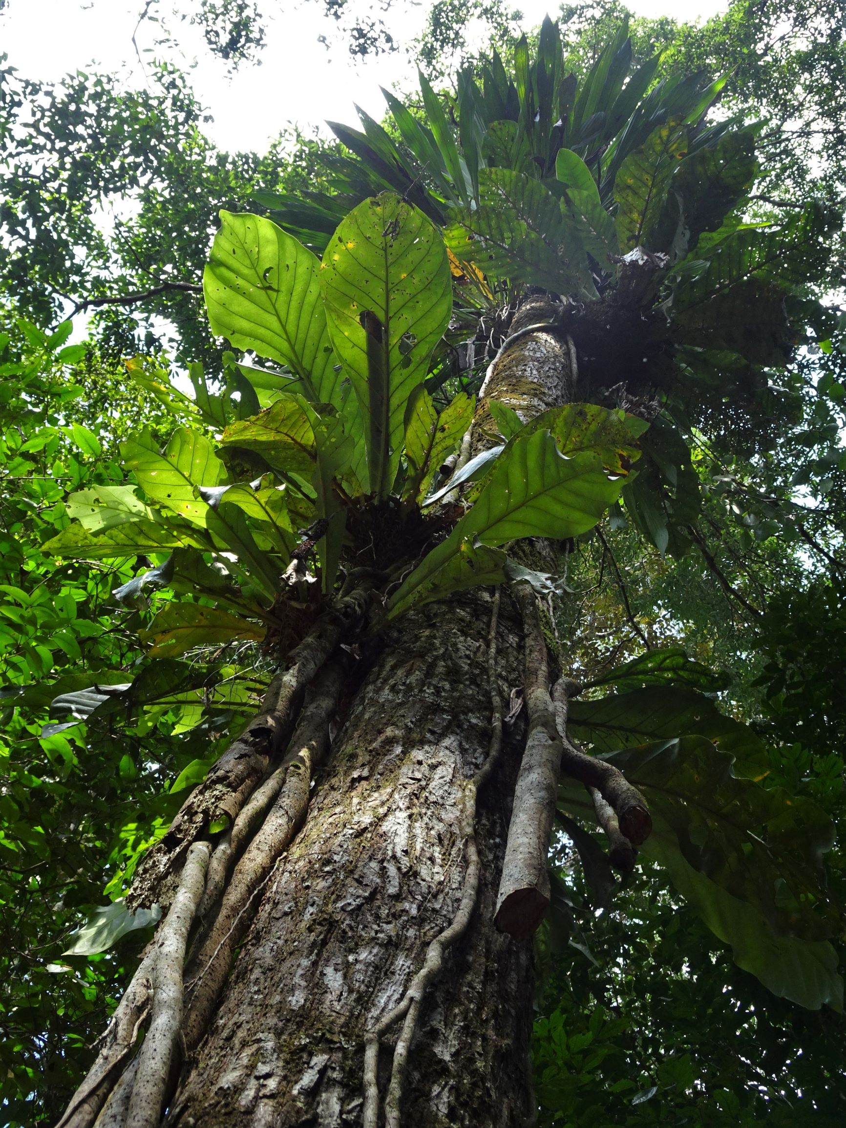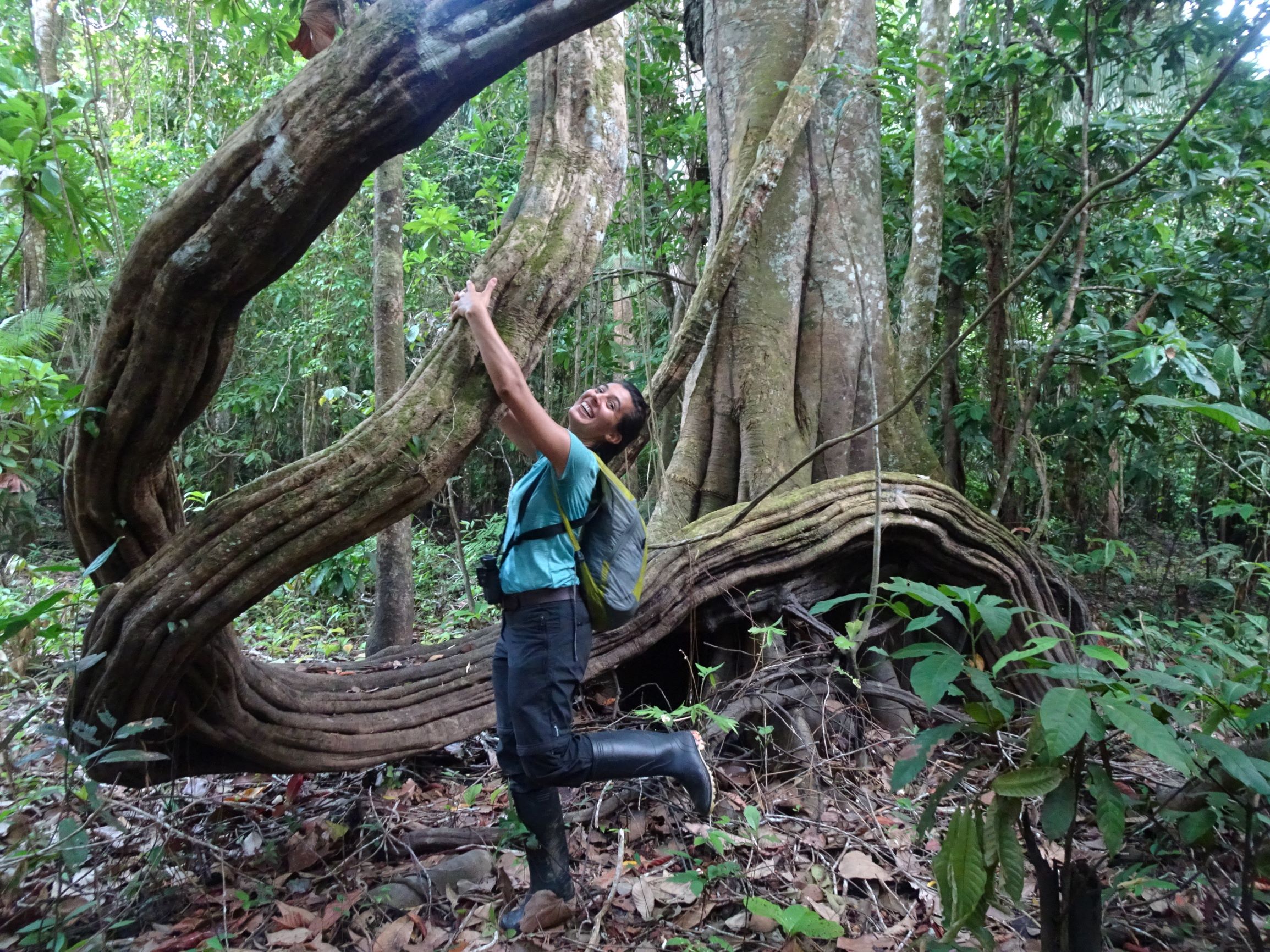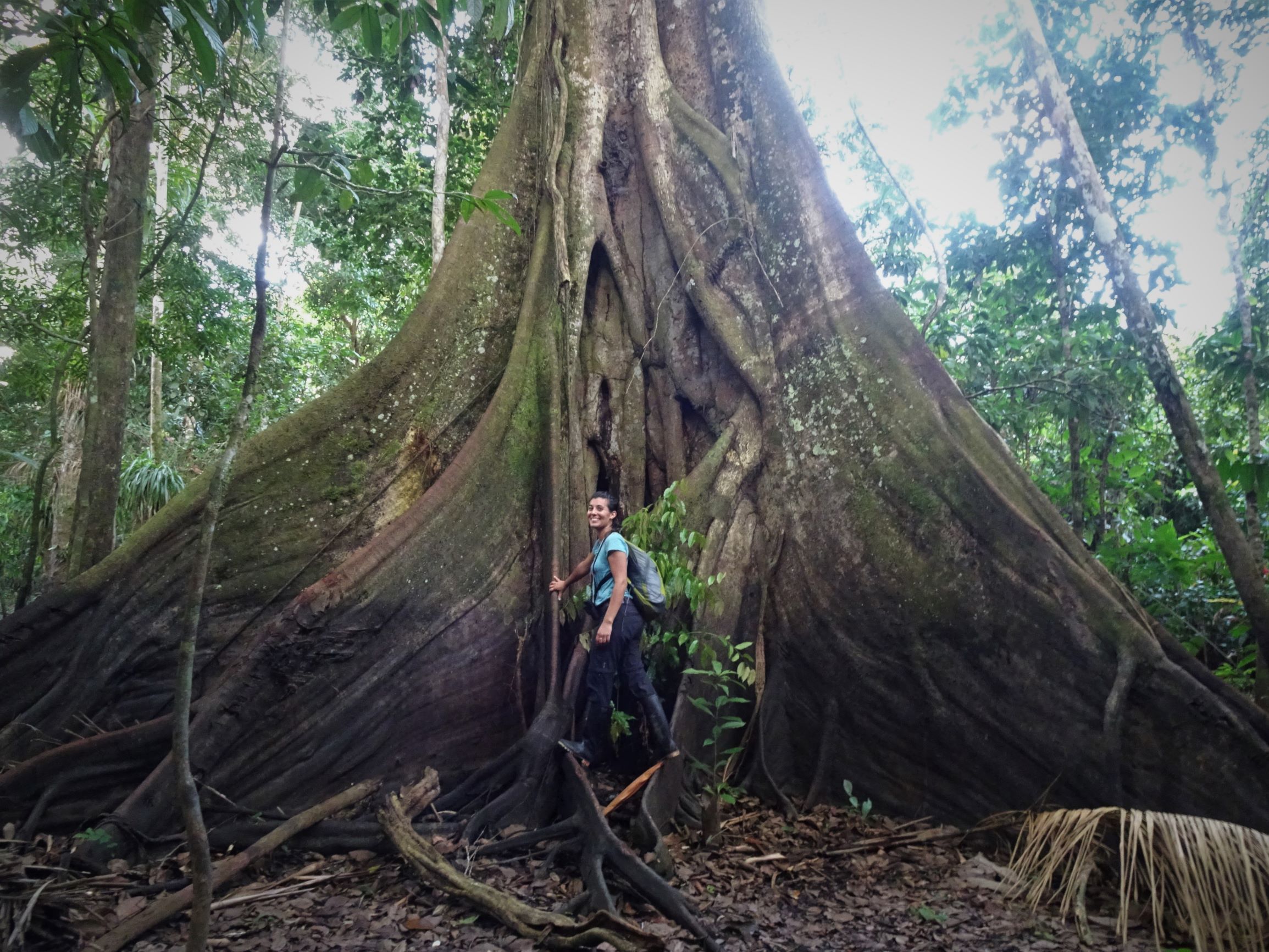 Ragaillardis, nous nous enfonçons dans la jungle péruvienne. Miguel notre guide s’entiche du prénom d’Audrey et « Audriiiiiii » devient notre surnom à tous les deux, régulièrement brandi à gorge déployée pour amputer nos quarts d’heure toulousains. La terre que nous foulons est sèche et tapissée de feuilles mortes, mais en période de crue, les eaux monteront d’environ 6 m et la forêt sera inondée jusqu’aux mollets. Les premiers kilomètres de marche se font dans une jungle relativement préservée, au sous-bois clair obscurci par de grands et beaux arbres. Miguel nous explique que de l’écorce rouge de tel arbre on tire une teinture, que de la sève toxique de tel autre on empoisonne les flèches. Nous dominent également des Hévéas au précieux caoutchouc, des Fromagers et Capinuri aux imposants contreforts racinaires – utilisés pour la fabrication de pagaies et comme tambour-télégraphe pour communiquer à travers la jungle – et de tentaculaires figuiers étrangleurs.