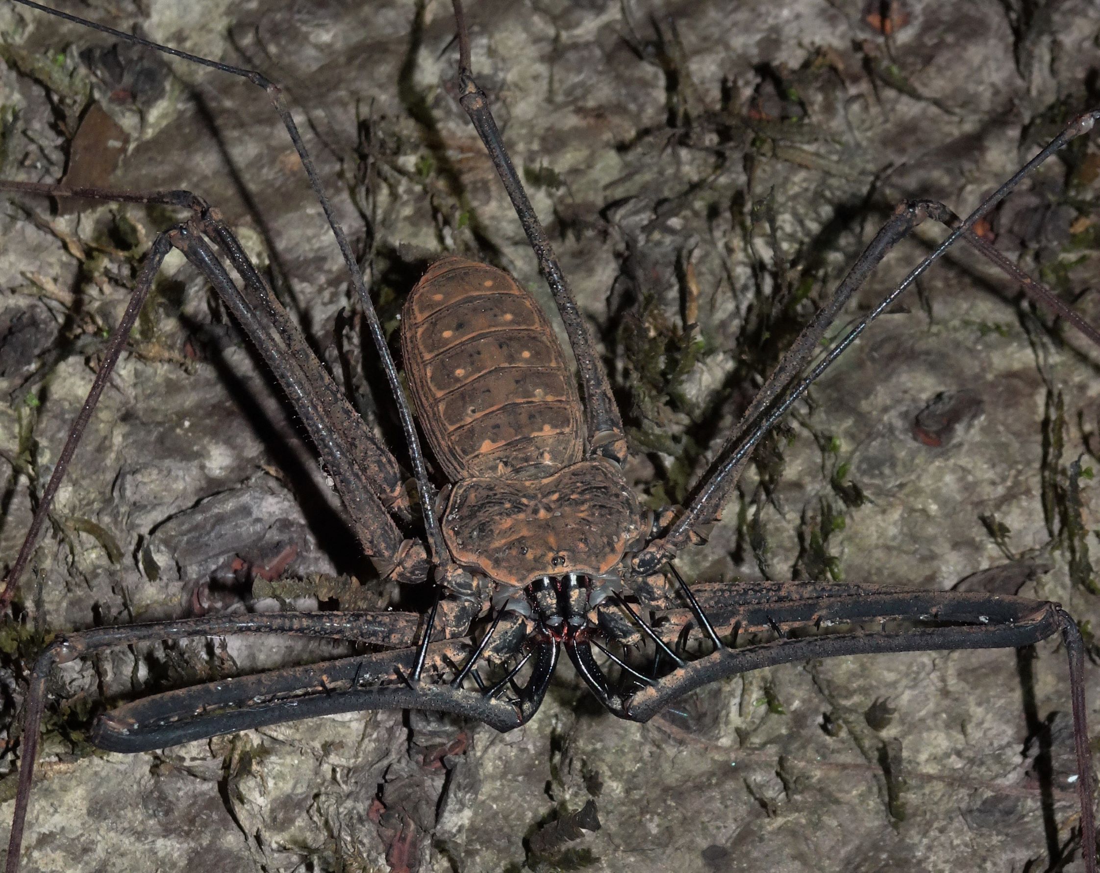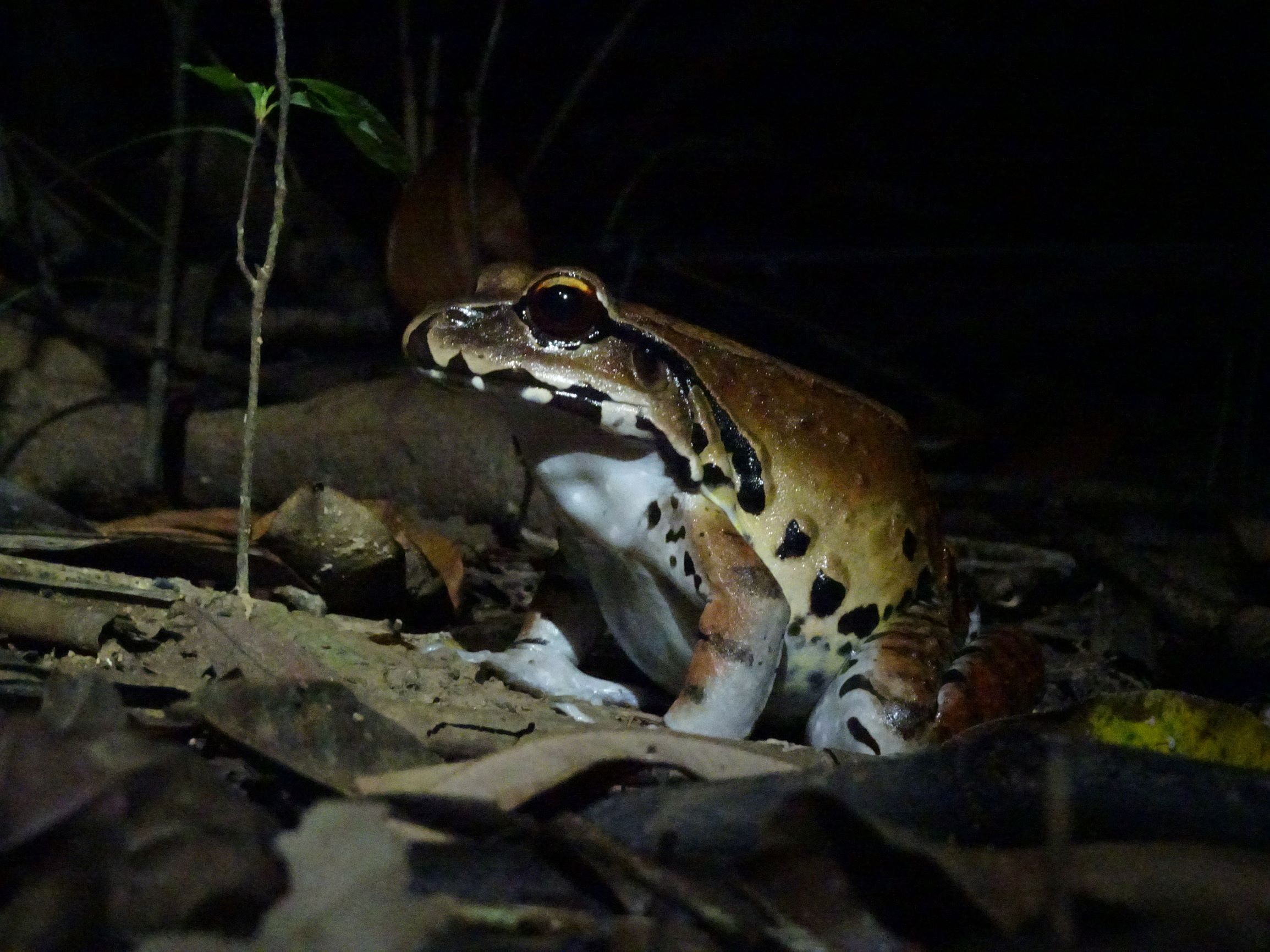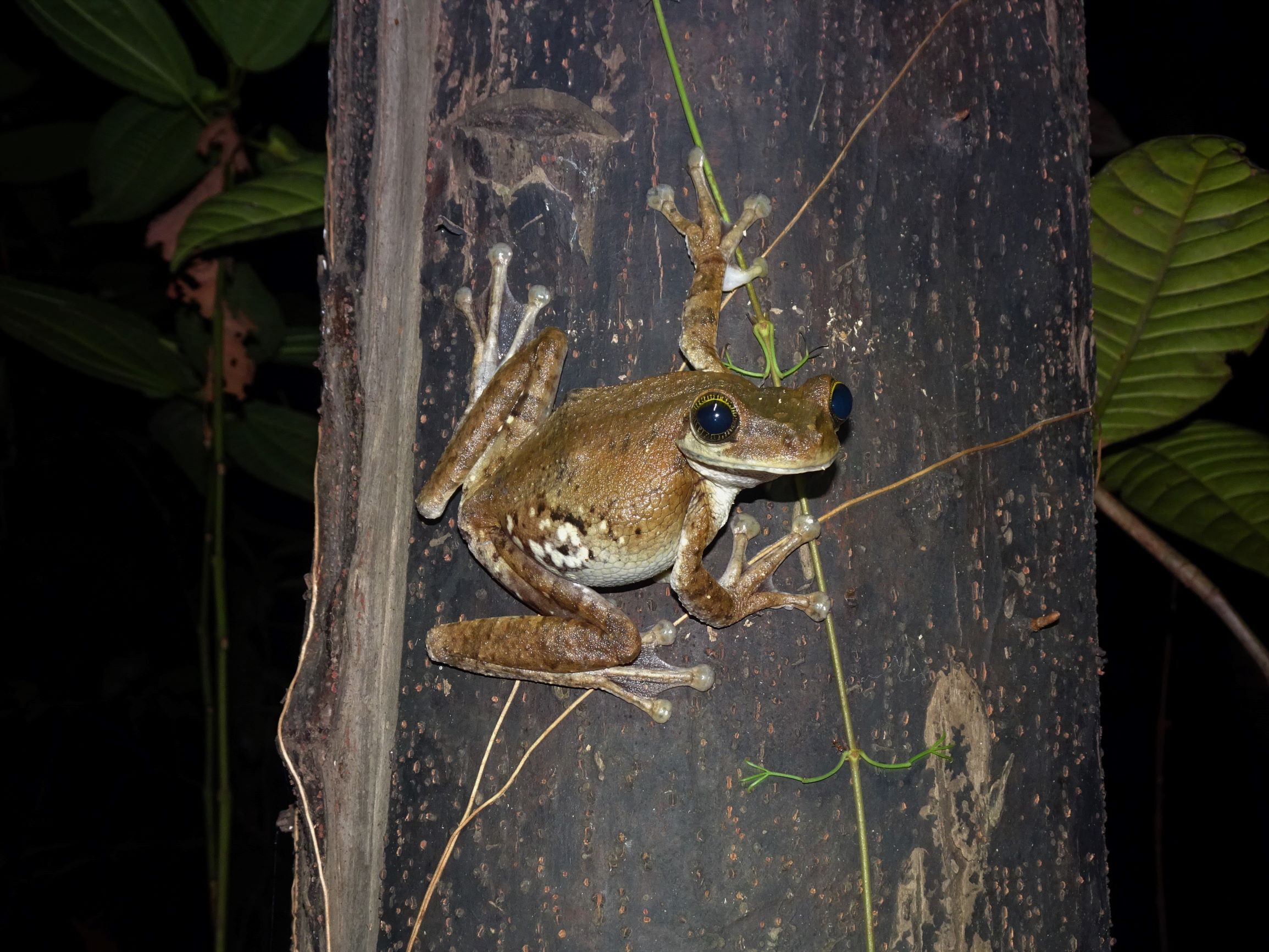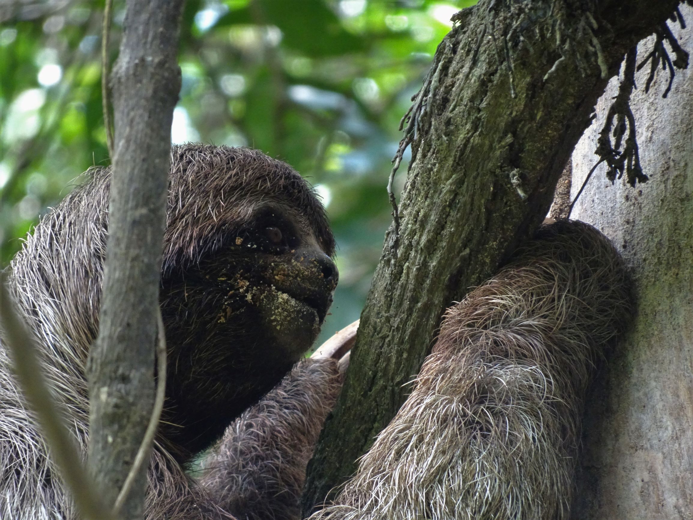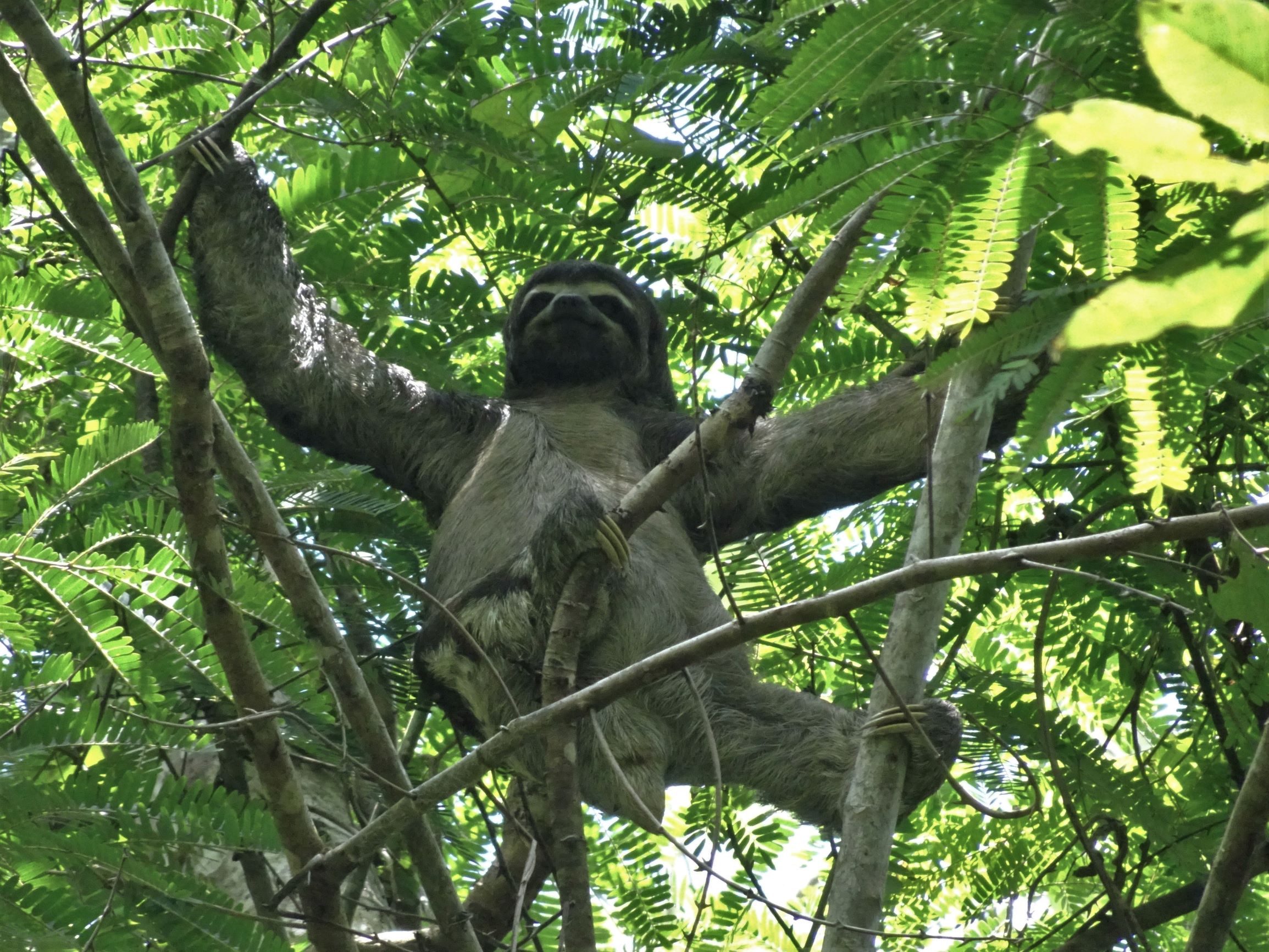 Autour du village, nous surprenons quelques paresseux alanguis le jour – dont un remontant de sa pause popo hebdomadaire sur la terre ferme – et une faune grouillante la nuit : tarentules, scorpions, araignées-scorpions, grenouilles, crapauds, salamandres, iules, moustiques… Plus loin dans une lagune, les yeux rouges de caïmans brillent dans le faisceau de nos frontales.