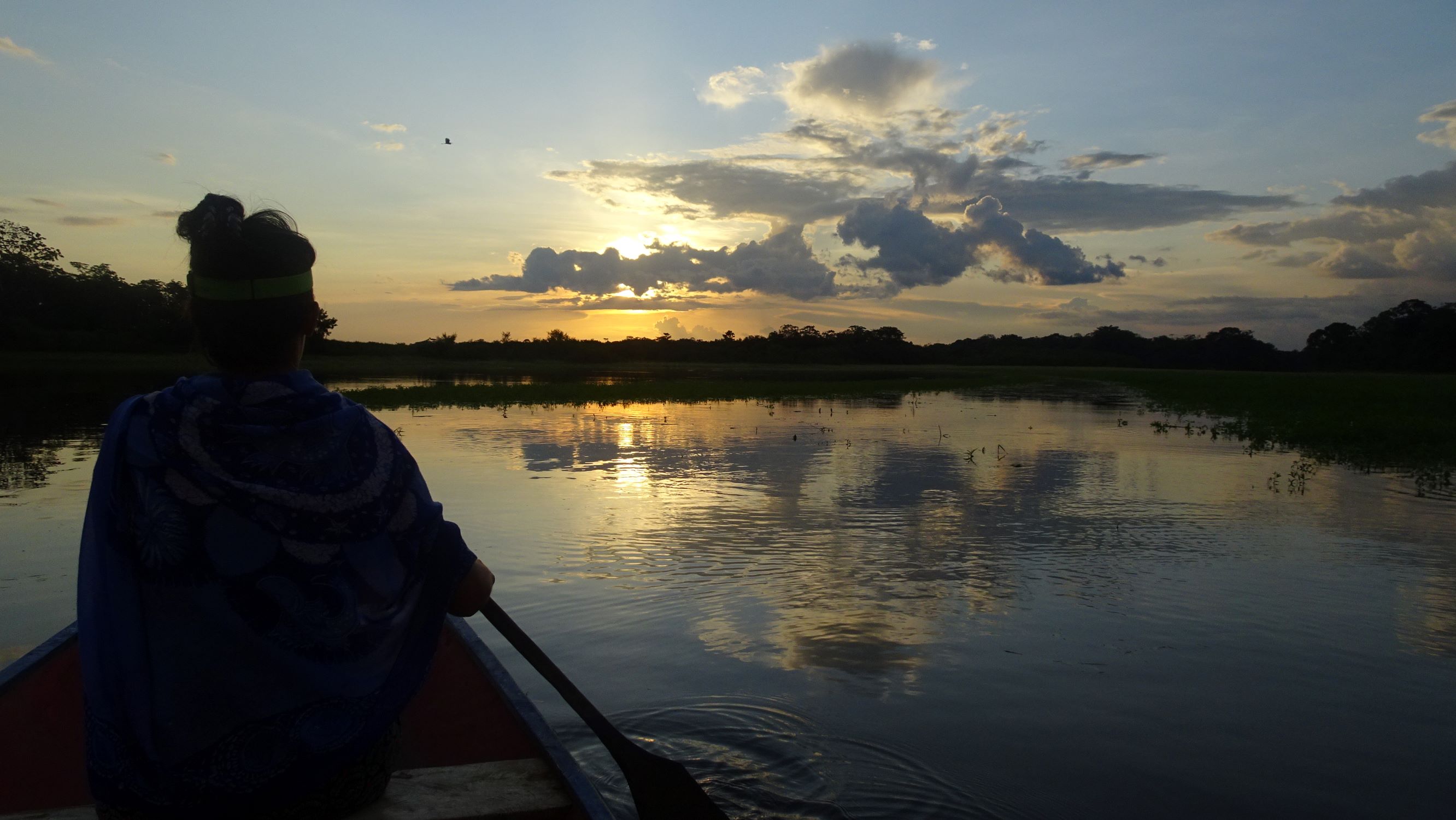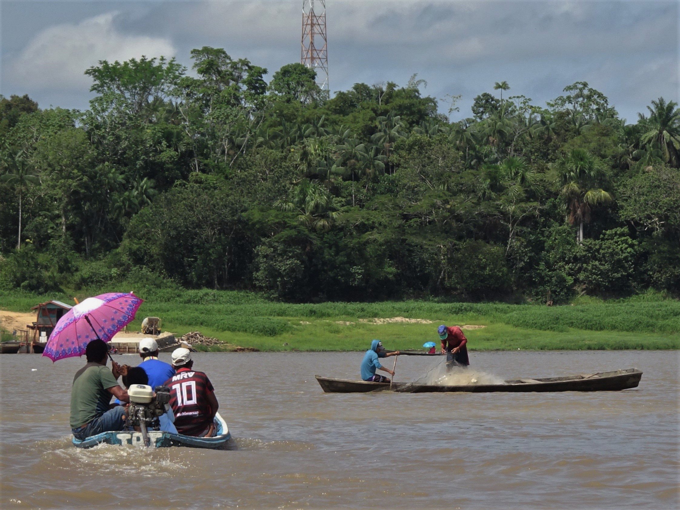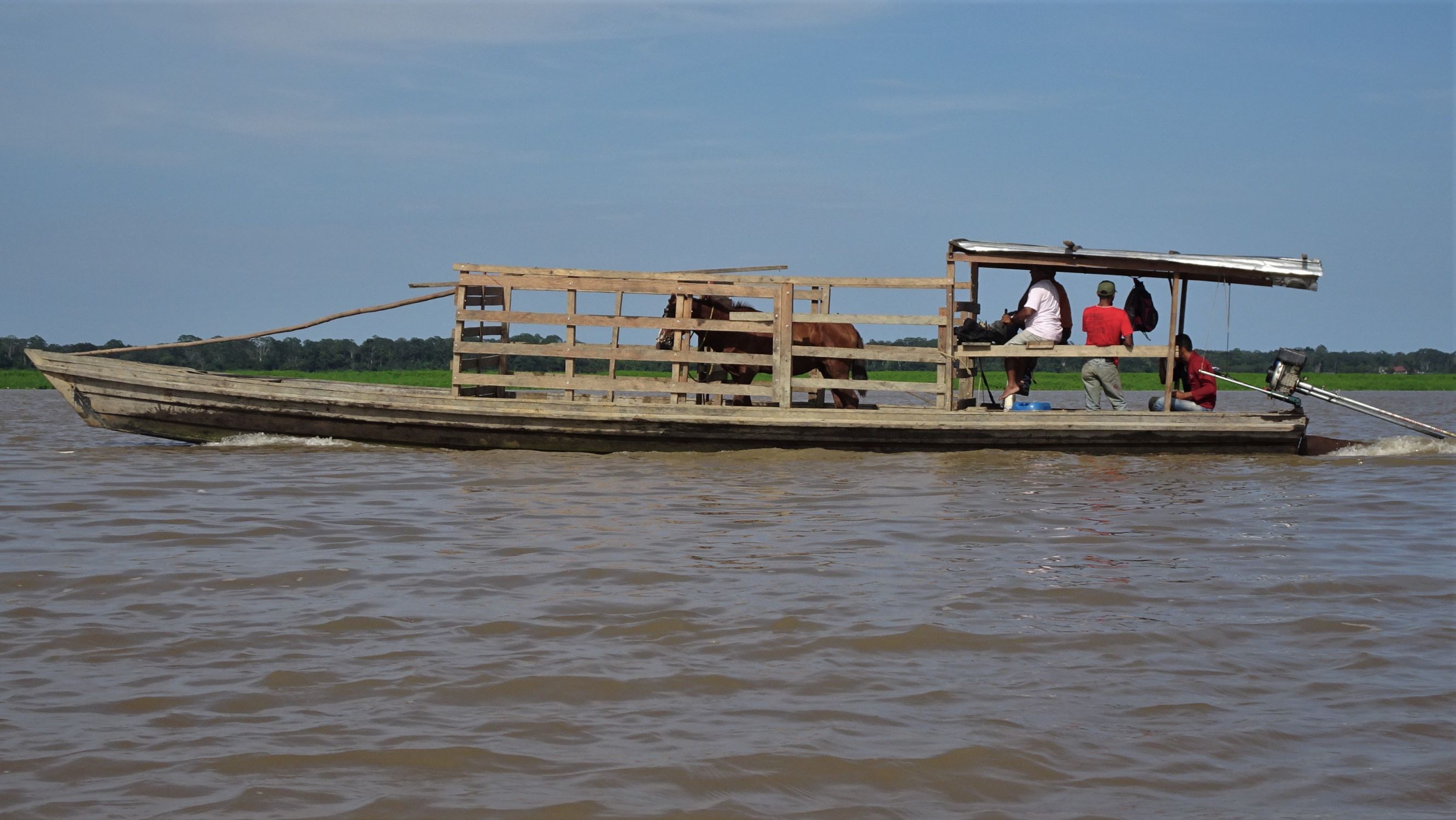 Au petit matin, Capitan Edgar nous embarque sur son frêle esquif. Une fois dépassées les cases et stations-services flottantes de l’Amazone, quelques dauphins gris et d’étonnants dauphins roses émergent furtivement des flots marron. Puis nous longeons de vastes grèves sableuses à la confluence avec le Rio Yavari sur lequel nous nous engageons. A bâbord, quelques bourgades brésiliennes, Islandia et Benjamin Constant. A tribord, des scieries péruviennes puis la jungle inondable où nous passerons les trois prochains jours. Voguant autour de nous, dragues, barges, pêcheurs au filet, une « écurie » flottante et d’élégantes ombrelles.
