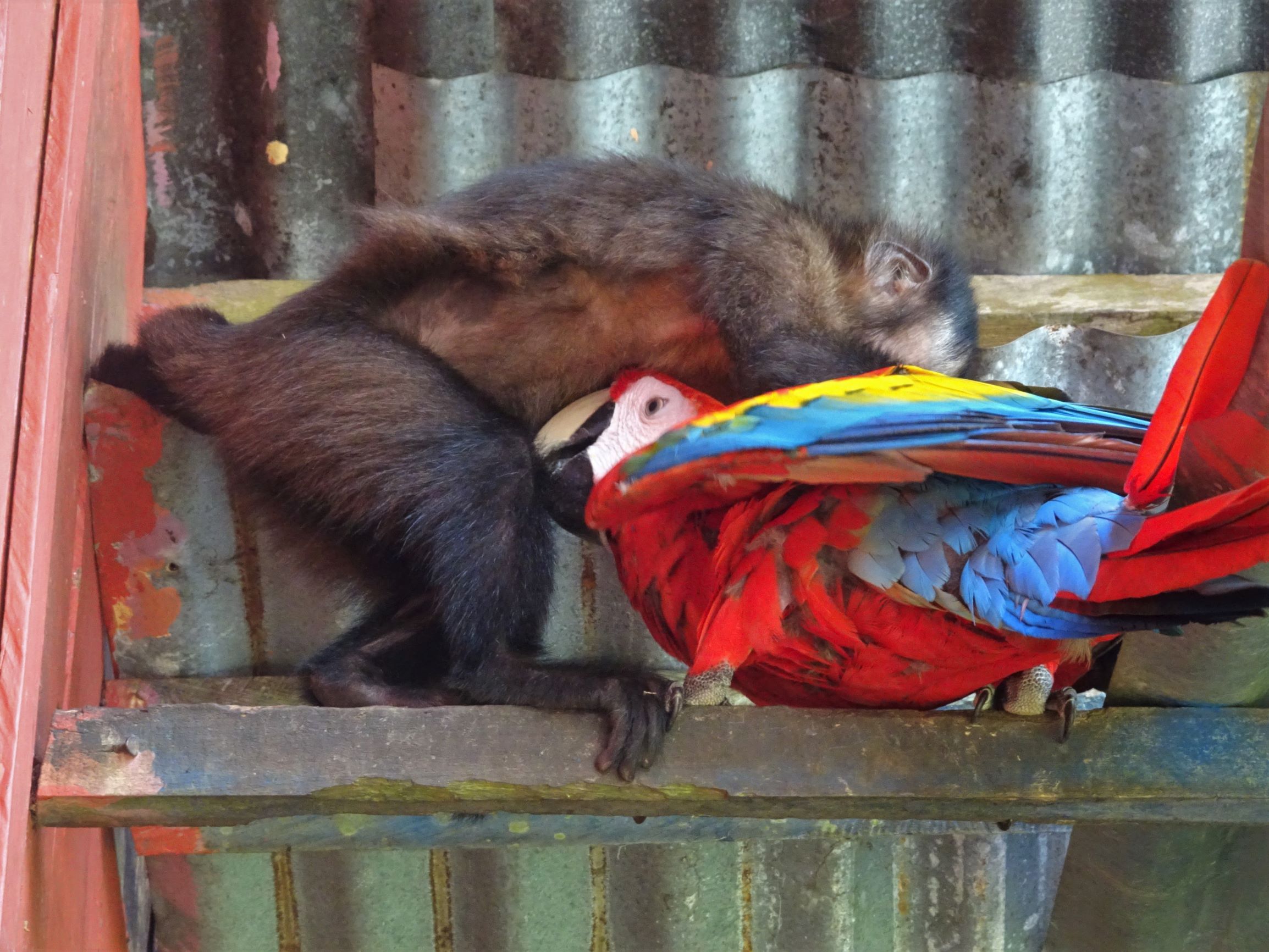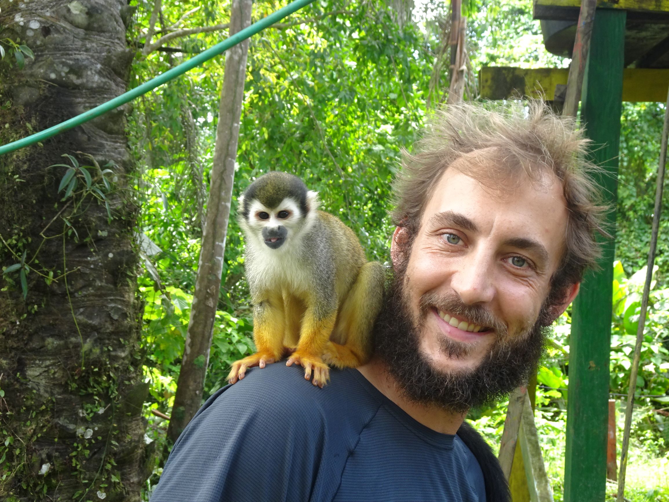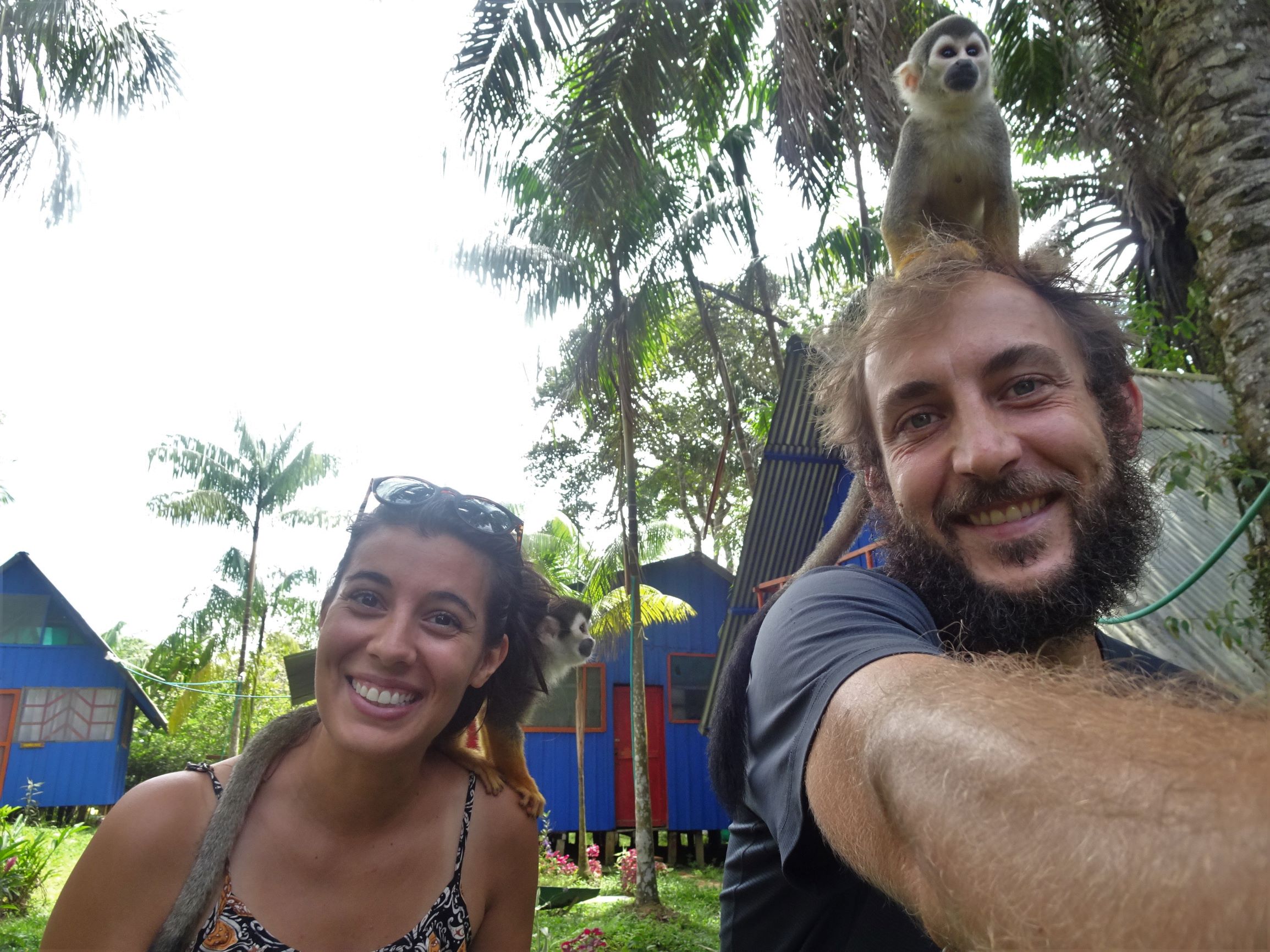 Et alors que nous sommes prompts à faire les gros yeux aux personnes qui nourrissent les animaux sauvages (sauf cas particuliers, ça n’est pas les aider), nous tombons sous le charme des aras et singes semi-domestiqués de notre auberge. Aleja, espiègle capucine, se faufile dans notre case au petit jour pour nous chiper nos effets les plus sensibles. En un tournemain, elle s’empare des lentilles de contact d’Audrey et ne tarde pas à faire main basse sur les pastilles destinées à prévenir le grossissement prématuré de nos rangs. A peine le temps de nous extirper de sous la moustiquaire qu’elle nous nargue de son précieux butin depuis les poutres de la case. Une habile diversion à base de spaghettis crus, son mets préféré, nous permettra de récupérer nos biens.